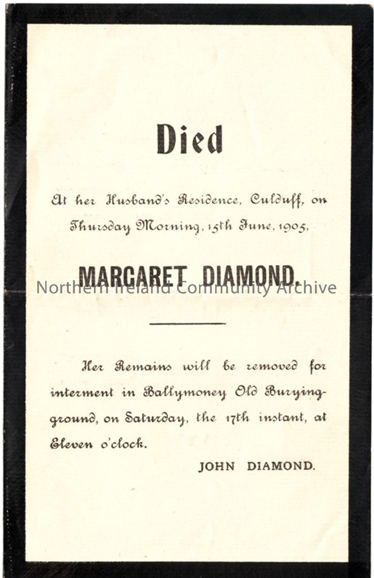Margaret Diamond of Culduff, buried in Ballymoney Old Burying ground d. 15th June 1905