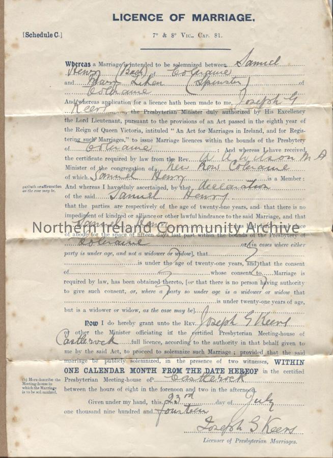 Sam and Maimie Henry's marriage license, dating to 23rd July 1914.