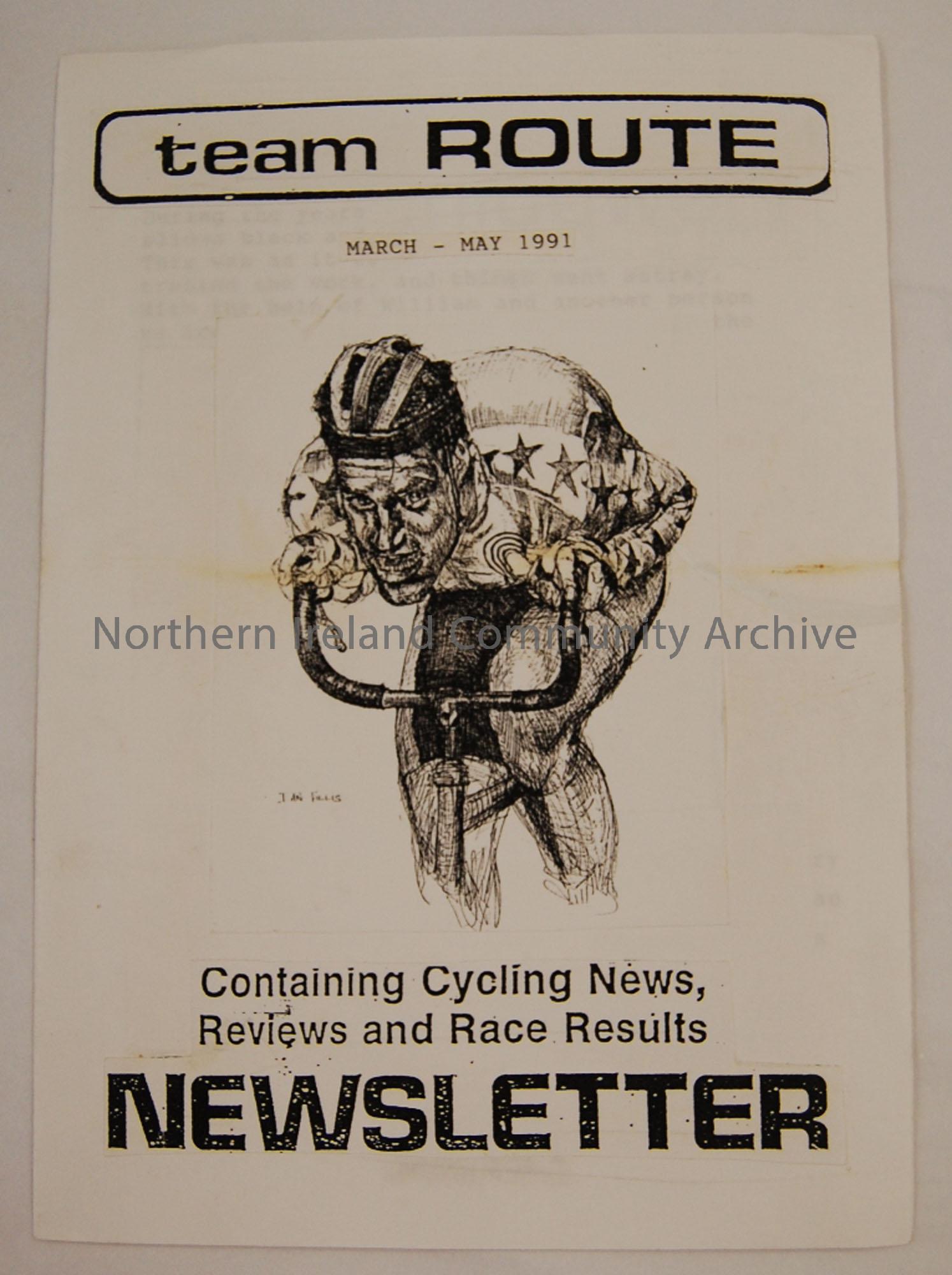 Master copy of the Team Route Newsletter March/May 1991. Magazine of the Ballymoney and district cycle club containing cycling news, reviews and race results.