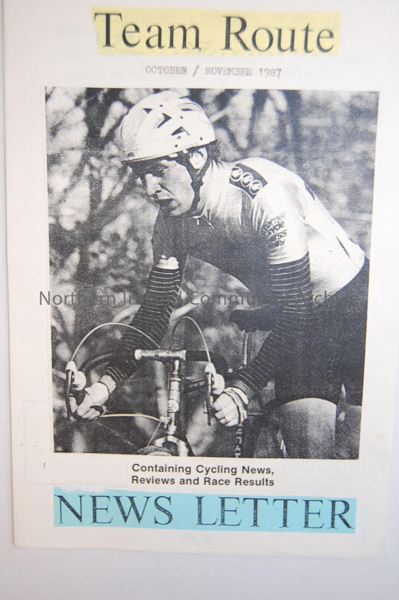 Master copy of the Team Route Newsletter October/November 1987. Magazine of the Ballymoney and district cycle club detailing recent club news, events and articles.