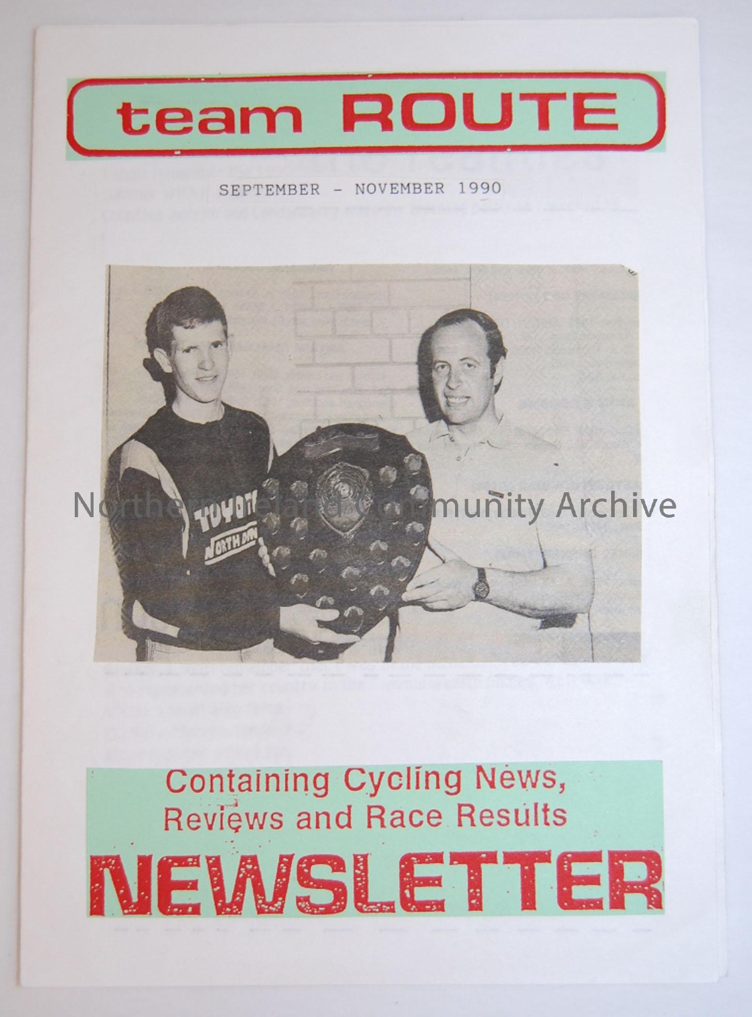 Master copy of the Team Route Newsletter September/November 1990. Magazine of the Ballymoney and district cycle club containing cycling news, reviews and race results.
