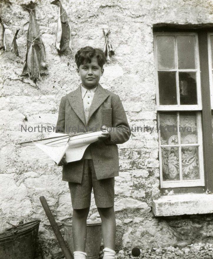 Boy (Master Hoare) - with toy fishing boat in front of whitewashed cottage, with fish drying on wall