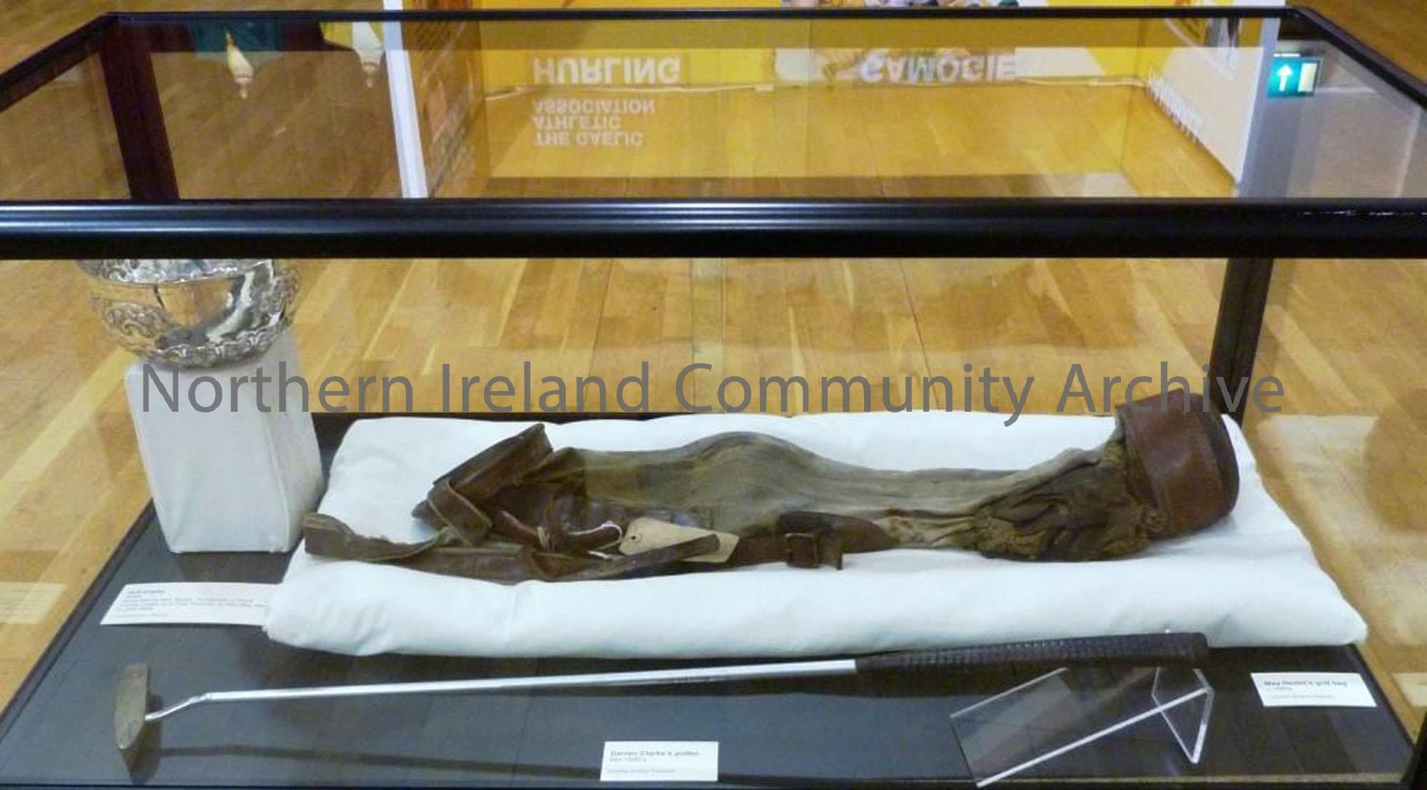 The August 2010 exhibition case containing May Hezlet's golf bag from the turn of the 19th/20th century, in very delicate condition, and her winner's rose bowl. Also featured is one of Darren Clarke's putters from the 1990s
