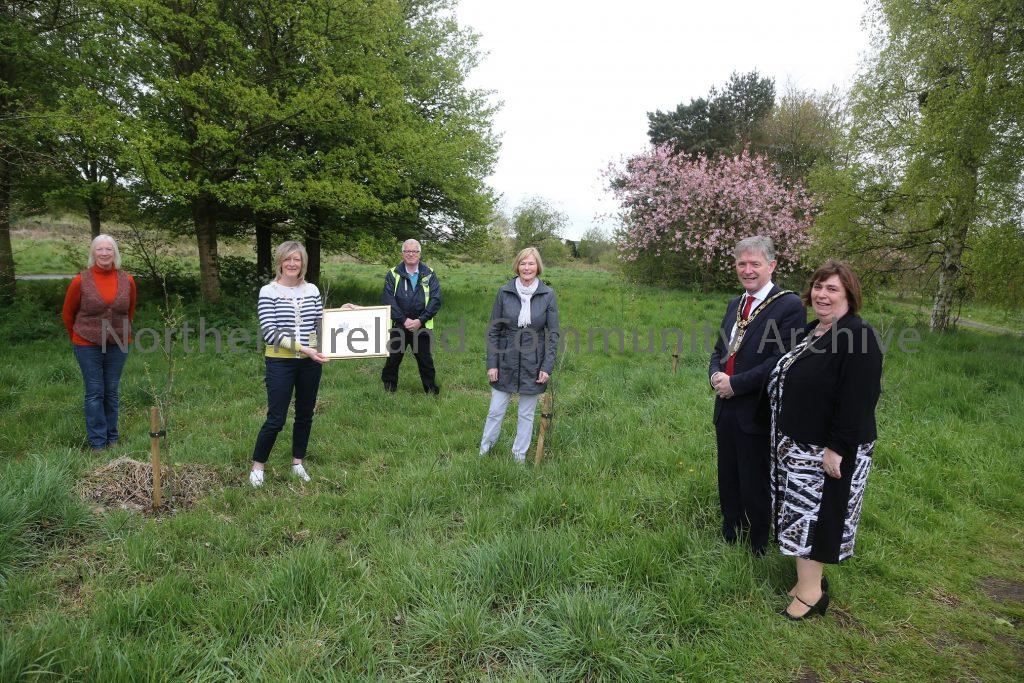 The Mayor of Causeway Coast and Glens Borough Council Alderman Mark Fielding and Mayoress Mrs Phyliss Fielding present a centenary gift to Fiona Murdock, Pamela Smyth and Ann Todd from Soroptimist International Ballymoney and District Club and Kenny Henry from Conservation Volunteers.