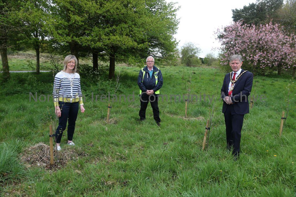 The Mayor of Causeway Coast and Glens Borough Council Alderman Mark Fielding pictured at Riverside Park in Ballymoney where 25 trees have been planted to mark the centenary of Soroptimist International with President Pamela Smyth and Kenny Henry from Conservation Volunteers.