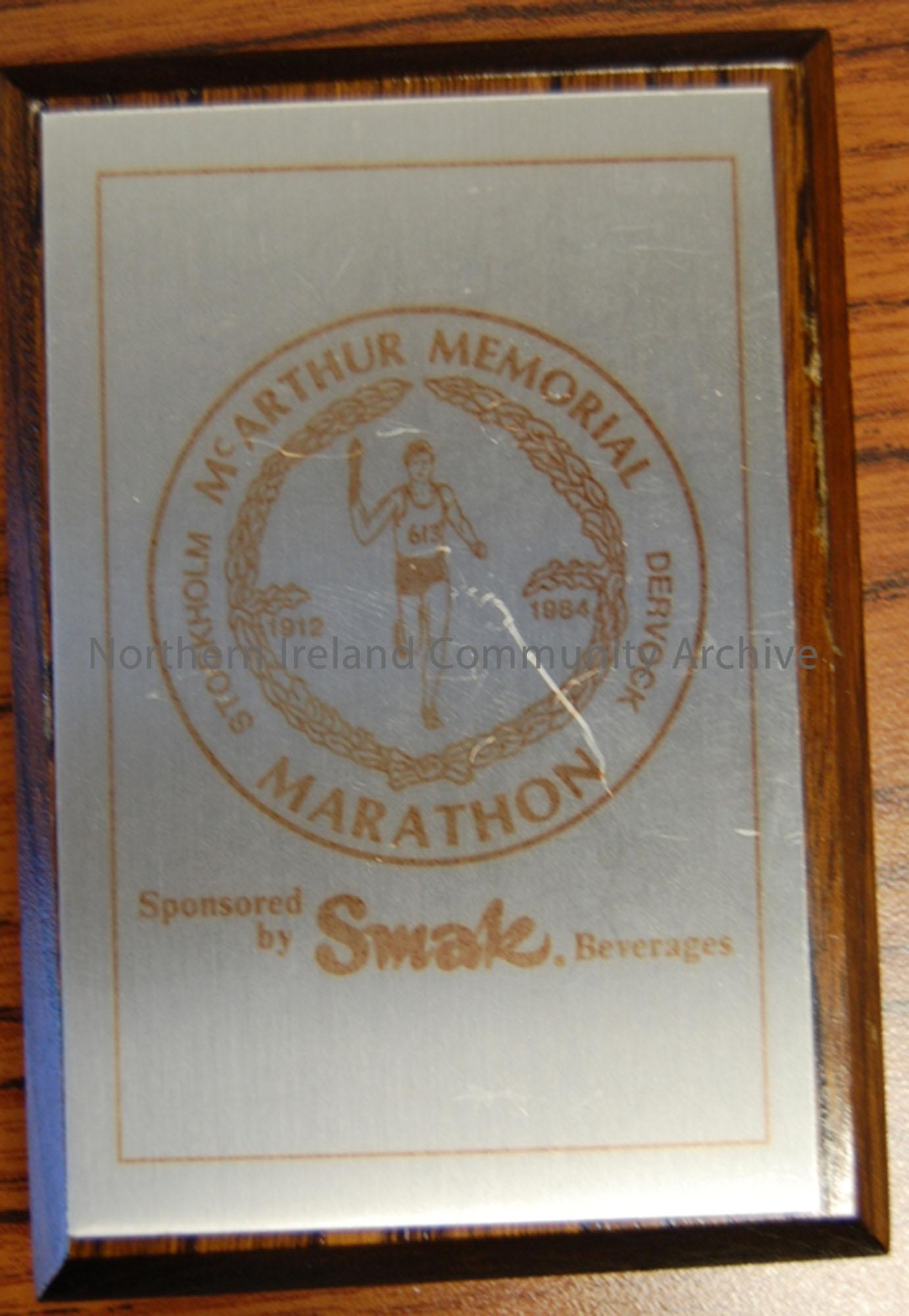 McArthur Memorial Marathon July 14th 1984 finishers plaque sponsored by Smak beverages.
