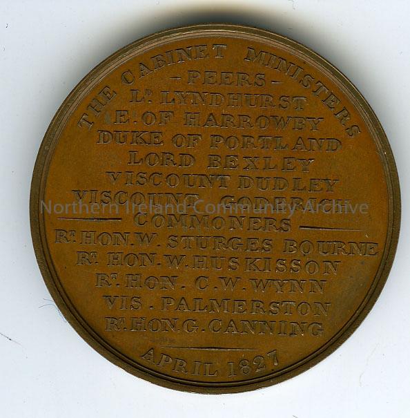 medal depicting R.Hon George Canning, with details of cabinet ministers to reverse. April 1827