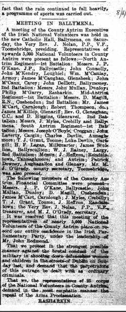 Article printed in the Ballymena Telegraph discussing how the National Volunteers feel about the Arms Ban.