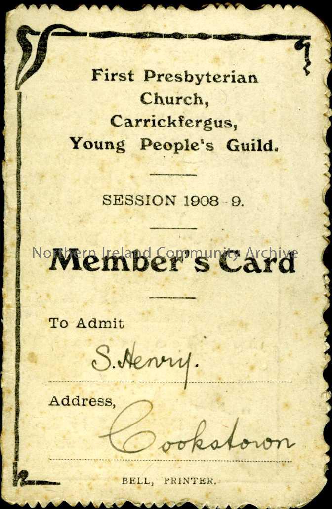 membership card of Carrickfergus First presbyterian Church’s Young People’s Guild, 1908-1909 session. Details of committee members on reverse