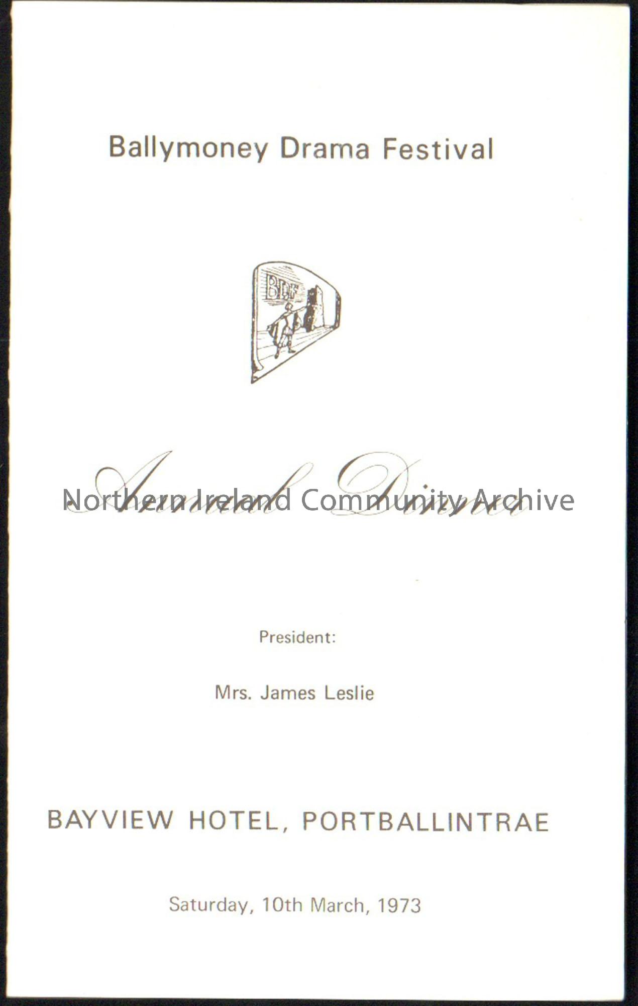 Menu for the annual dinner of Ballymoney Drama Festival held at Bayview Hotel, Portballintrae on 10th March 1973. White folded piece of cardboard with black writing and black Ballymoney Drama Festival logo at the top on the cover.