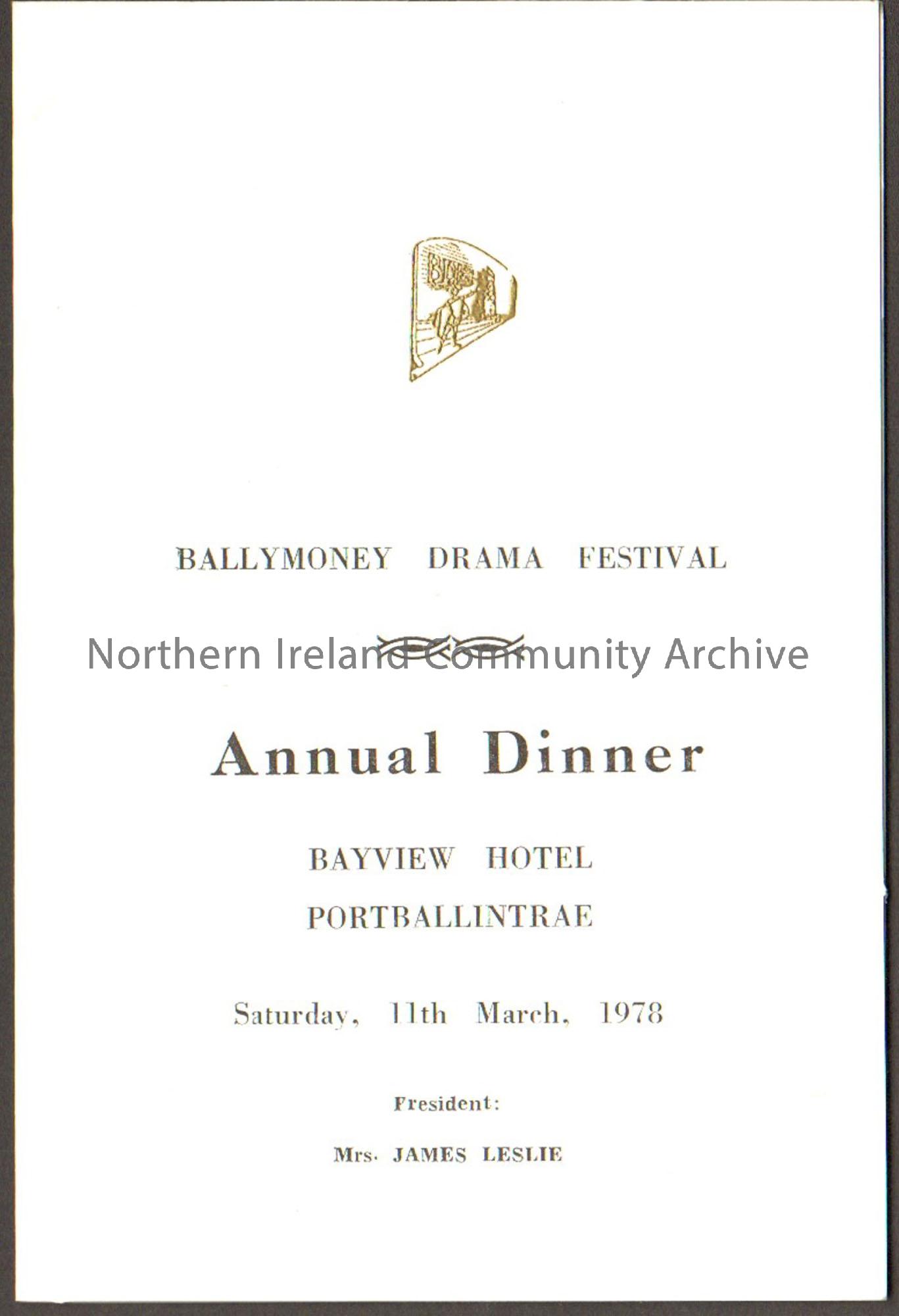 Menu for the annual dinner of Ballymoney Drama Festival held at Bayview Hotel, Portballintrae on 11th March 1978. White folded piece of cardboard with black writing and gold Ballymoney Drama Festival logo at the top on the cover.