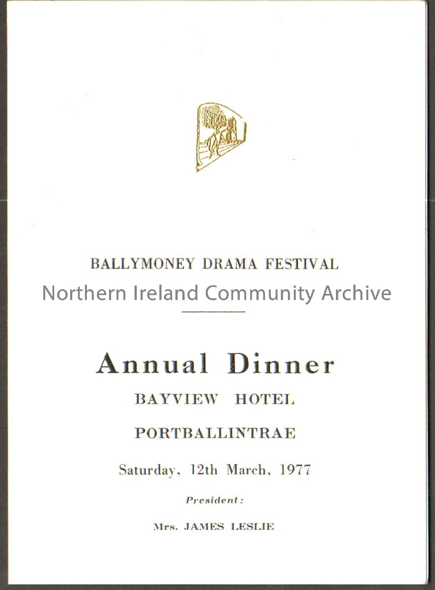 Menu for the annual dinner of Ballymoney Drama Festival held at Bayview Hotel, Portballintrae on 12th March 1977. White folded piece of cardboard with black writing and gold Ballymoney Drama Festival logo at the top on the cover.