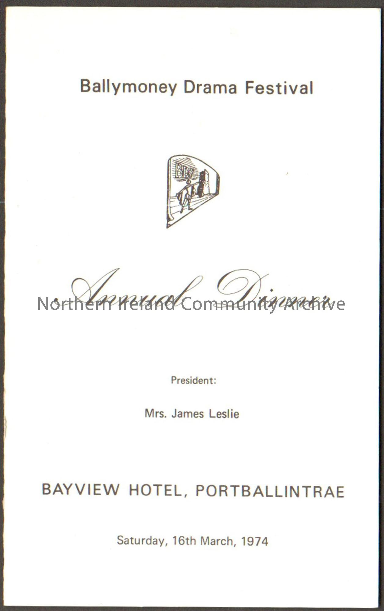 Menu for the annual dinner of Ballymoney Drama Festival held at Bayview Hotel, Portballintrae on 16th March 1974. White folded piece of cardboard with black writing and black Ballymoney Drama Festival logo at the top on the cover.