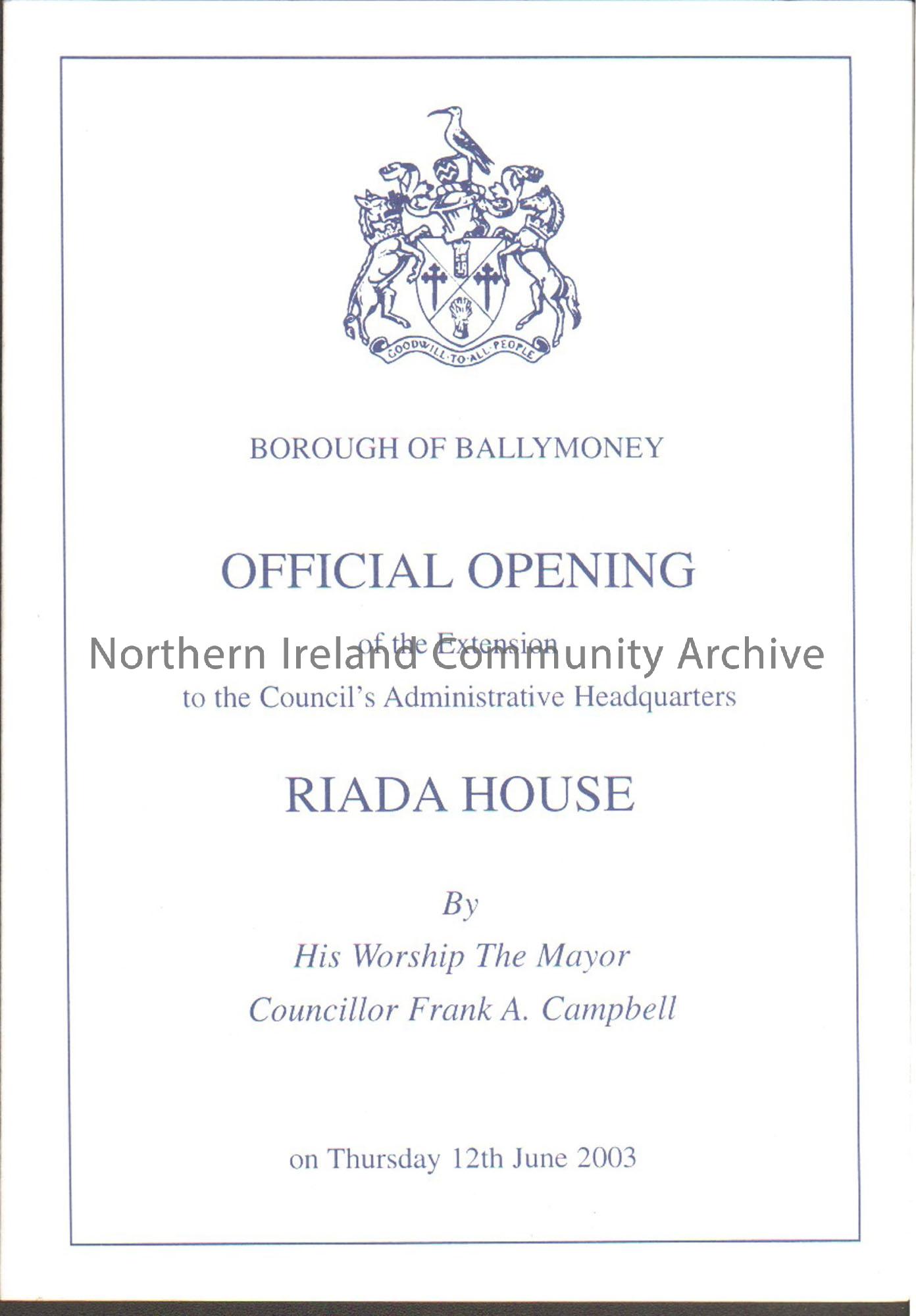 Menu for the official opening of the extension to the Council’s Administrative headquarters, Riada House, 12th June 2003. White with dark blue writing