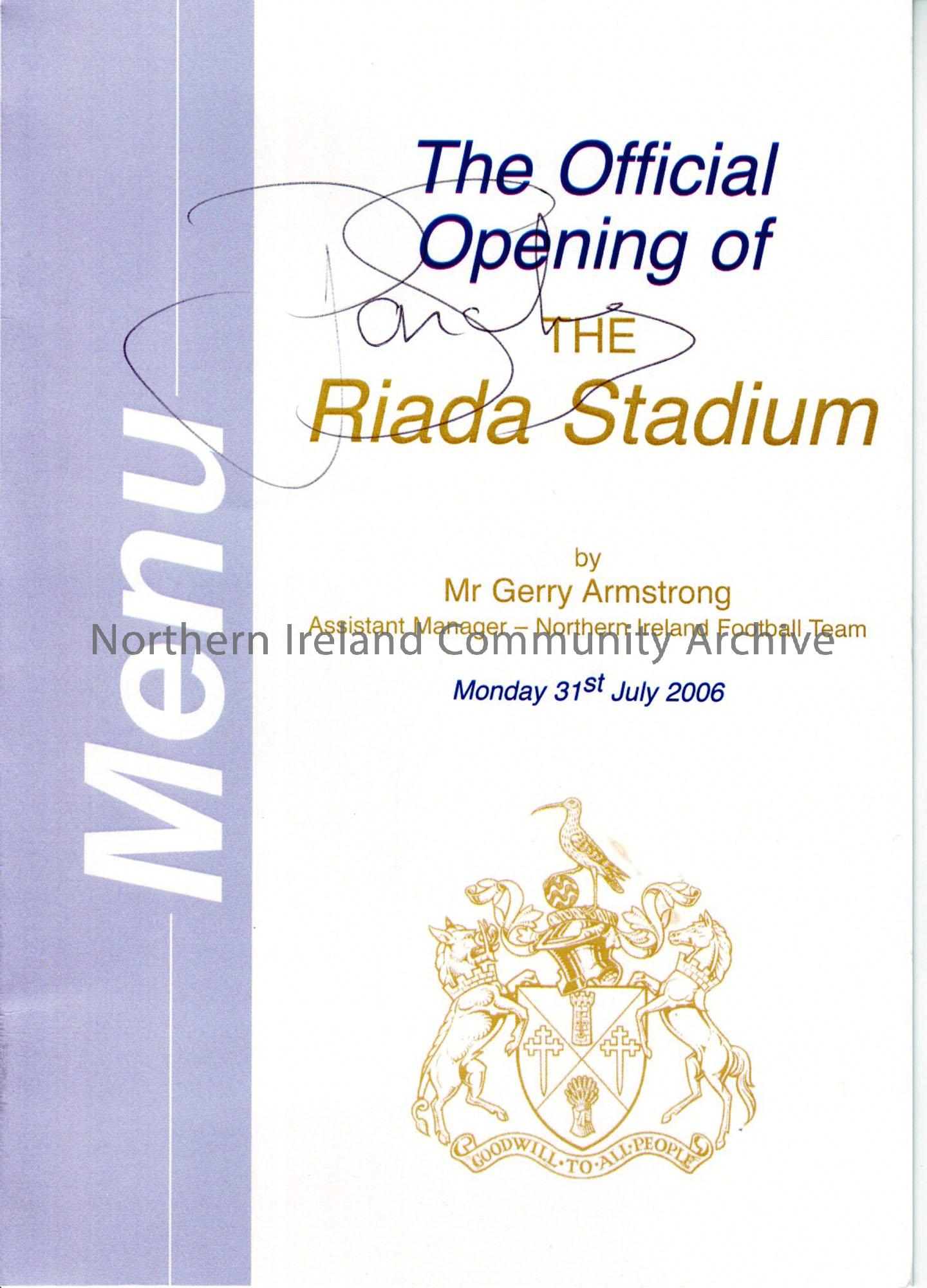 Menu of the official opening of the Riada stadium by Gerry Armstrong, Assistant Manager- Northern Ireland Football team, Monday 31st July 2006 autogra…