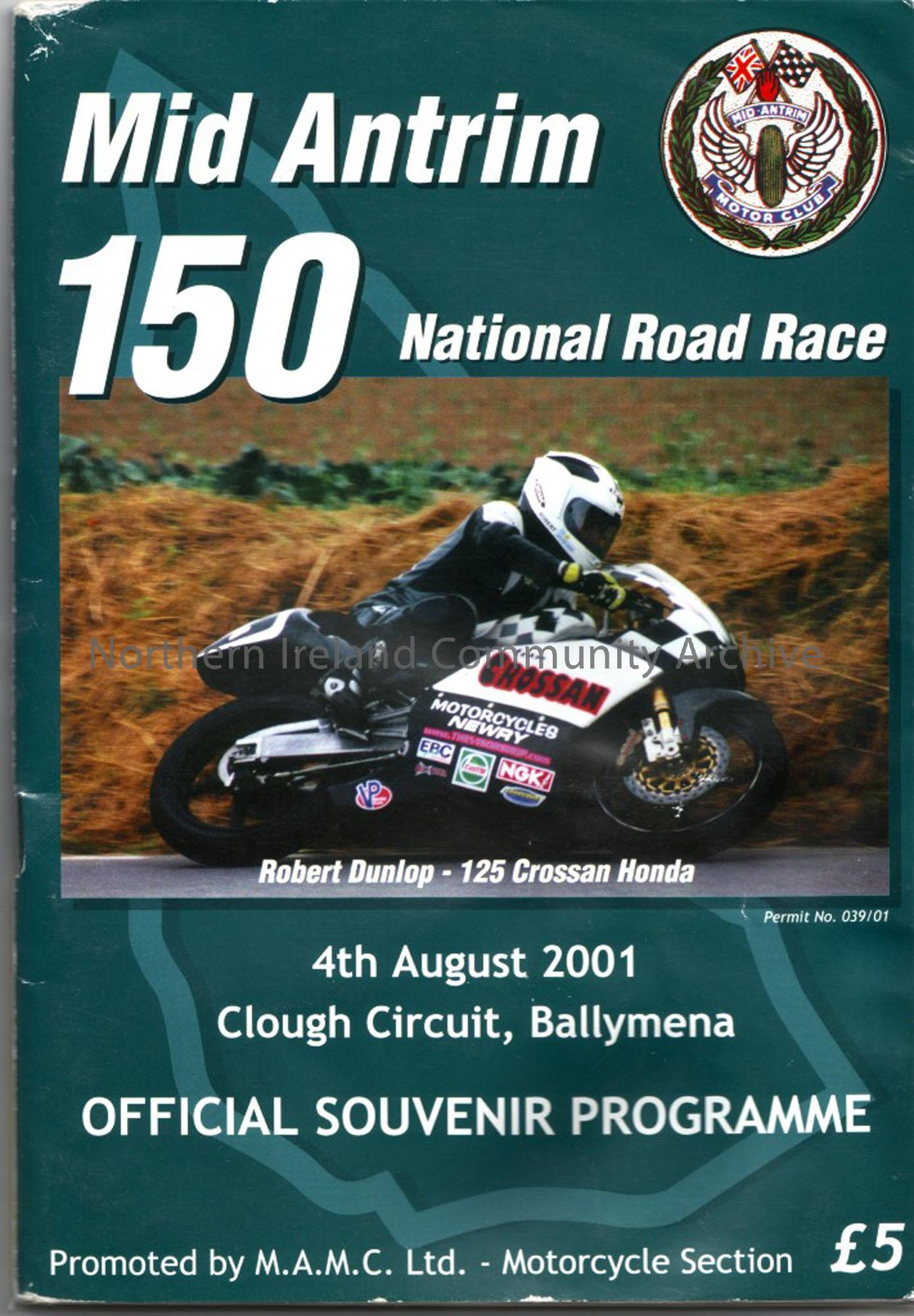 Mid Antrim 150 National Road Race. 4th August 2001, Clough Circuit, Ballymena official souvenir programme. Includes lists of Entrants in each class and lap score charts.
