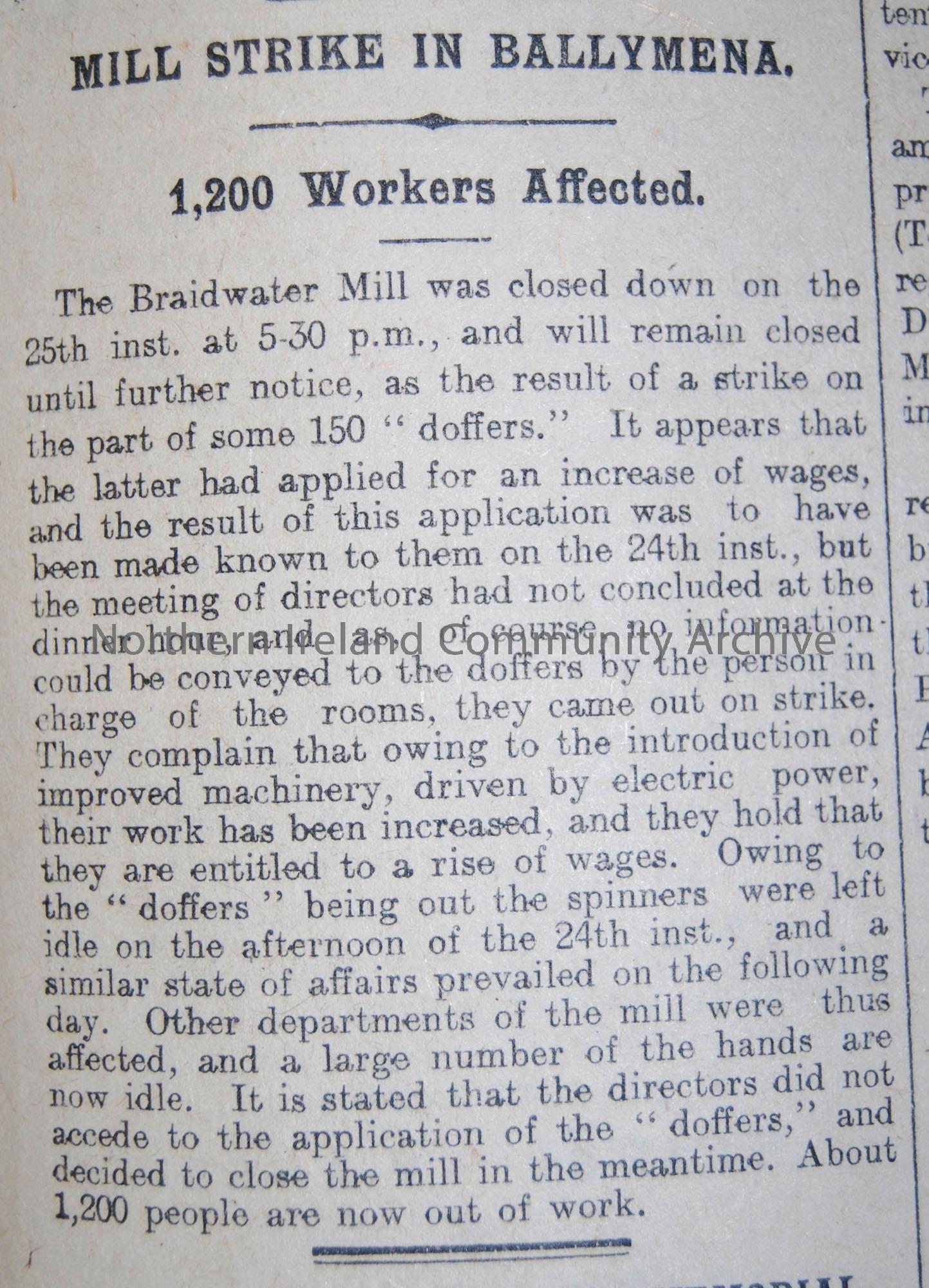Newspaper headline on a mill strike in Ballymena. 27.01.1911
