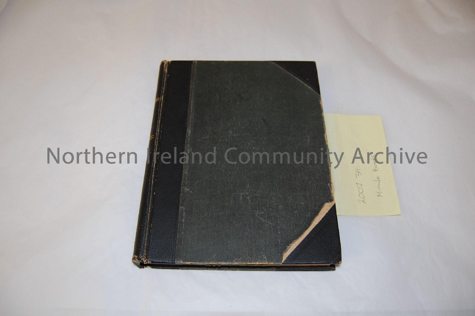 Minute book from the Route Hospital, 1949. Hard -backed book, partially leather bound. Alphabetised index of matters discussed at meetings. Inside cover reads 'The North Antrim Hospital Management Committee. handwritten notes up to page 134 out of 258 numbered pages