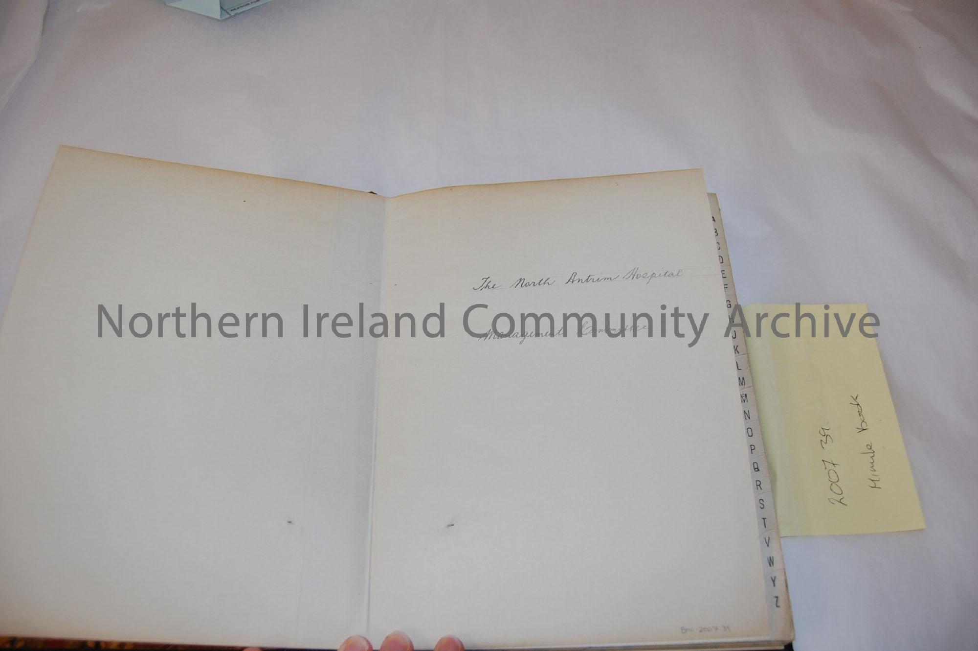 Minute book from the Route Hospital, 1949. Hard -backed book, partially leather bound. Alphabetised index of matters discussed at meetings. Inside cover reads 'The North Antrim Hospital Management Committee. handwritten notes up to page 134 out of 258 numbered pages