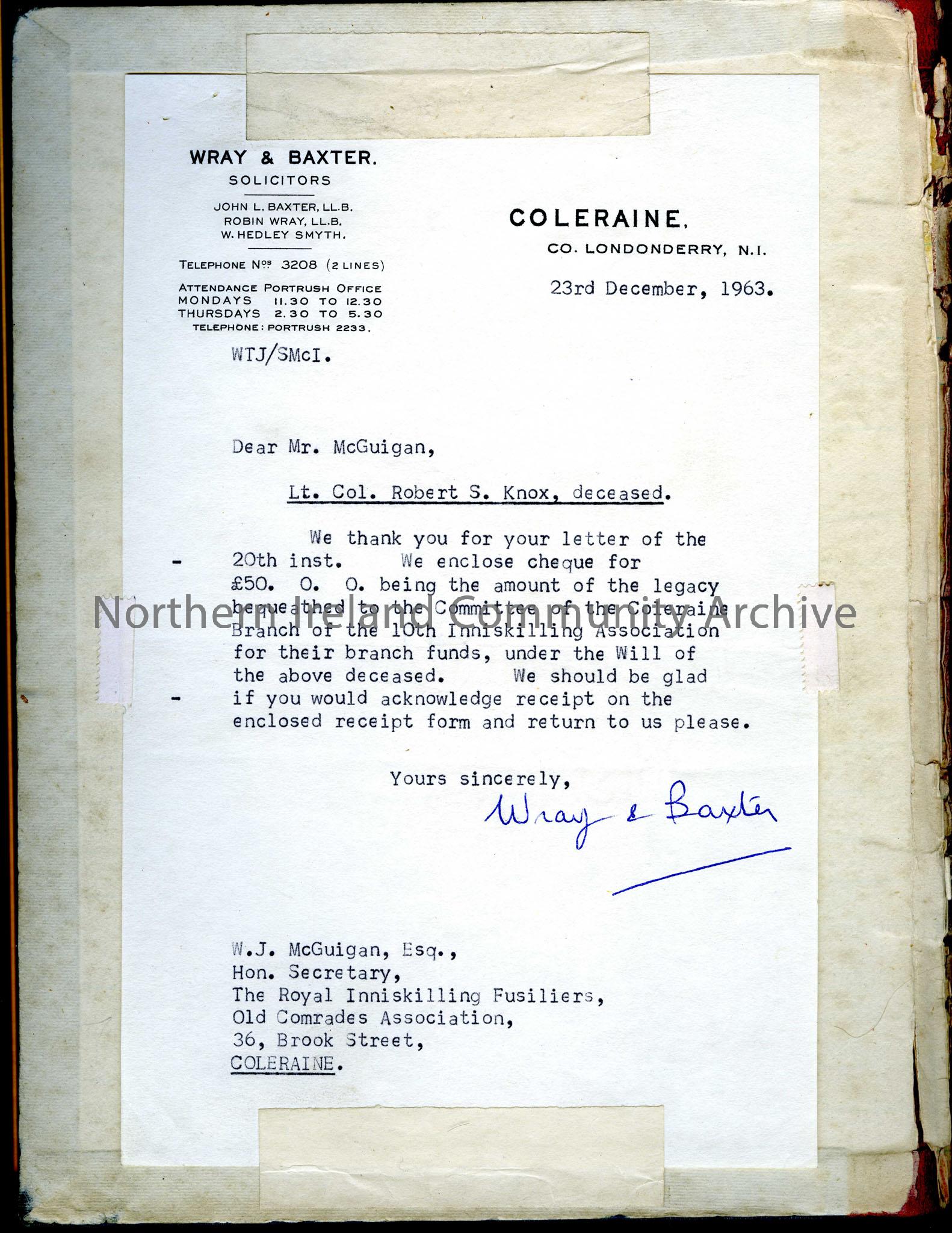 Minute book of 10th Royal Inniskillings Old Comrades Association 1950-1968. Letter attached to inside cover on Wray & Baxter Solicitors headed paper d… – CM2015421Scan914