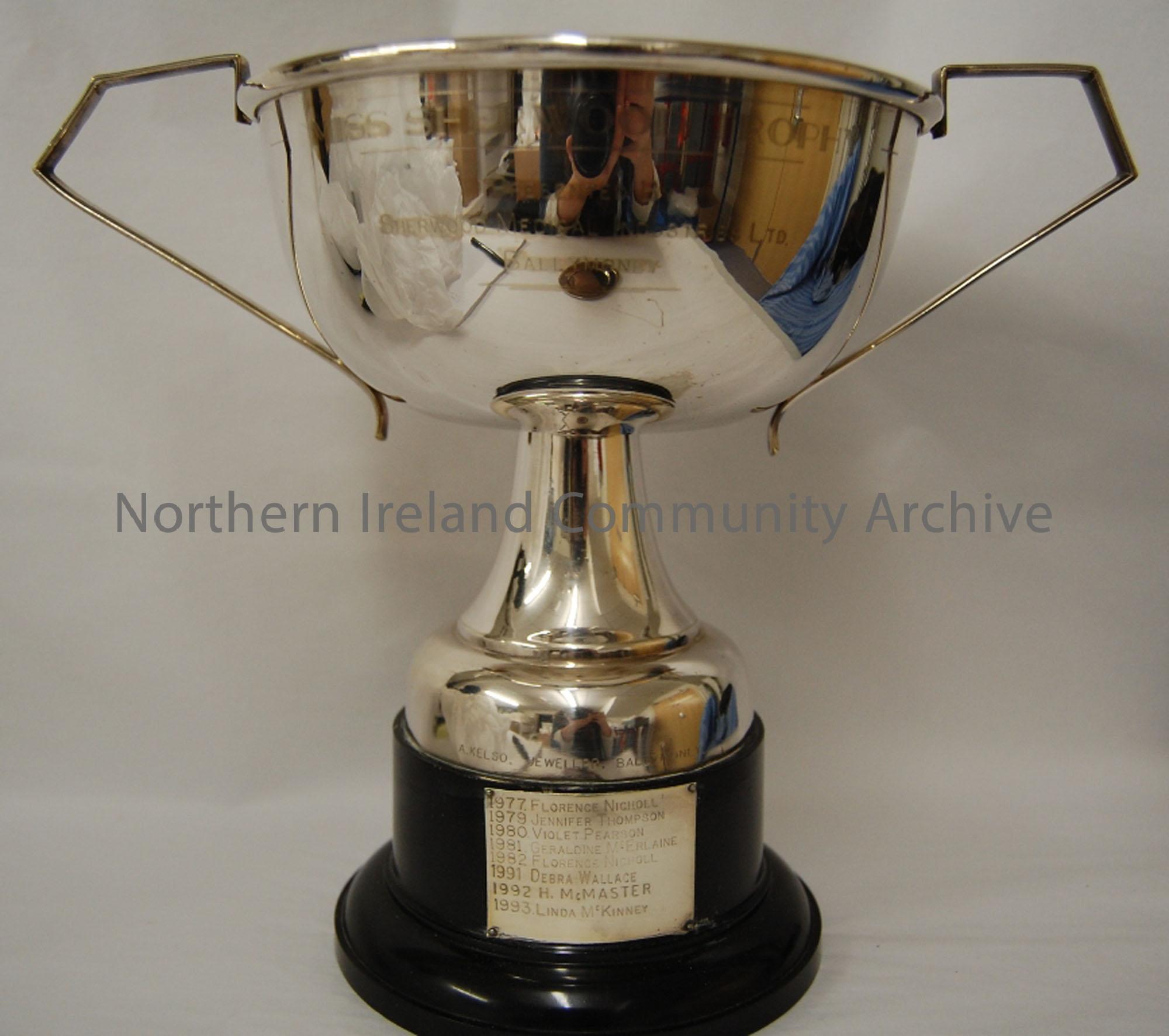 Miss Sherwood Trophy. Presented by Sherwood Medical Industries Ltd. Ballymoney. Awarded intermittently between 1977-1993. Made by A.Kelso, Jeweller, Ballymoney.