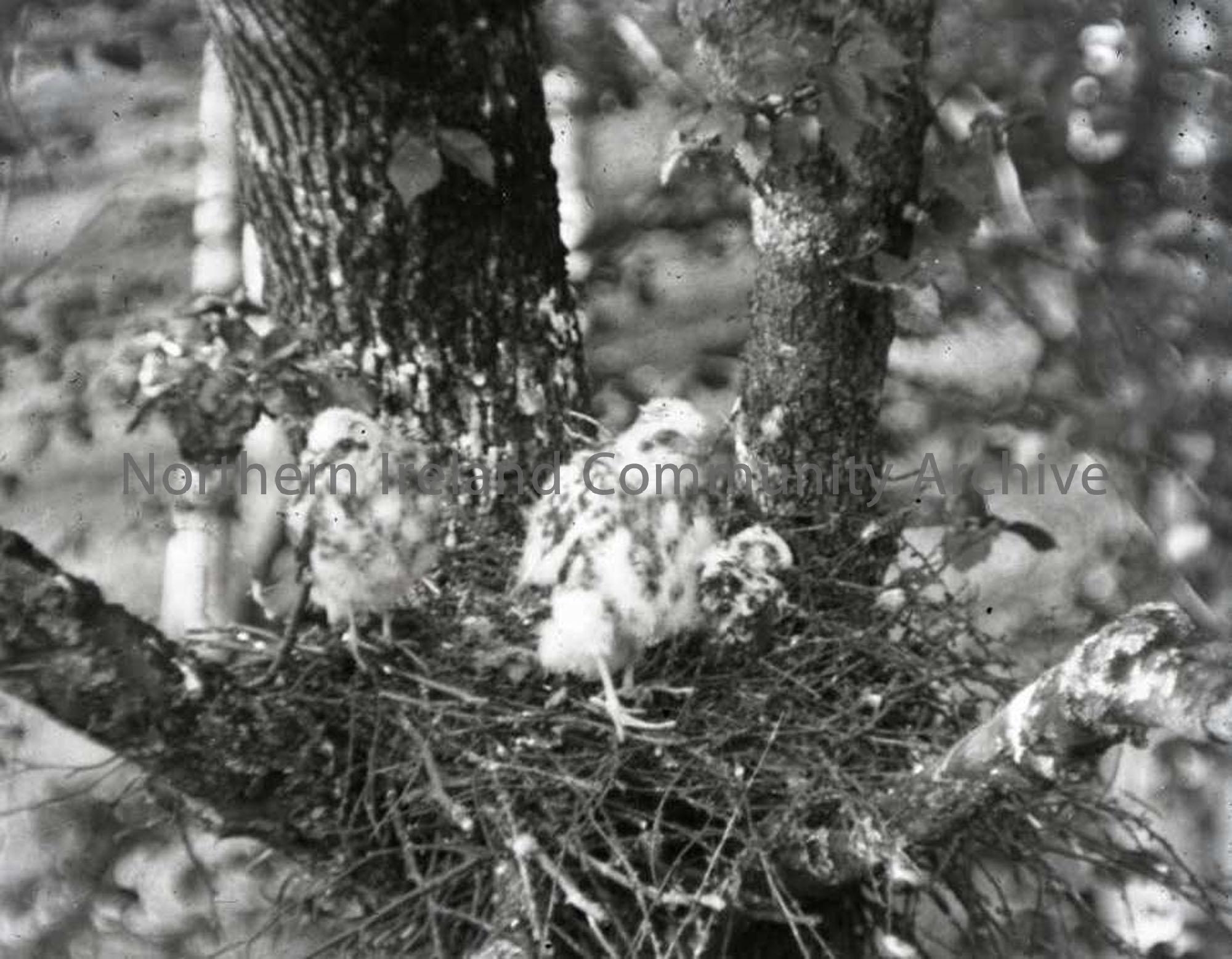 Entitled Missel thrushes - 2 birds in nest in tree. No 126 in Nature Slides inventory