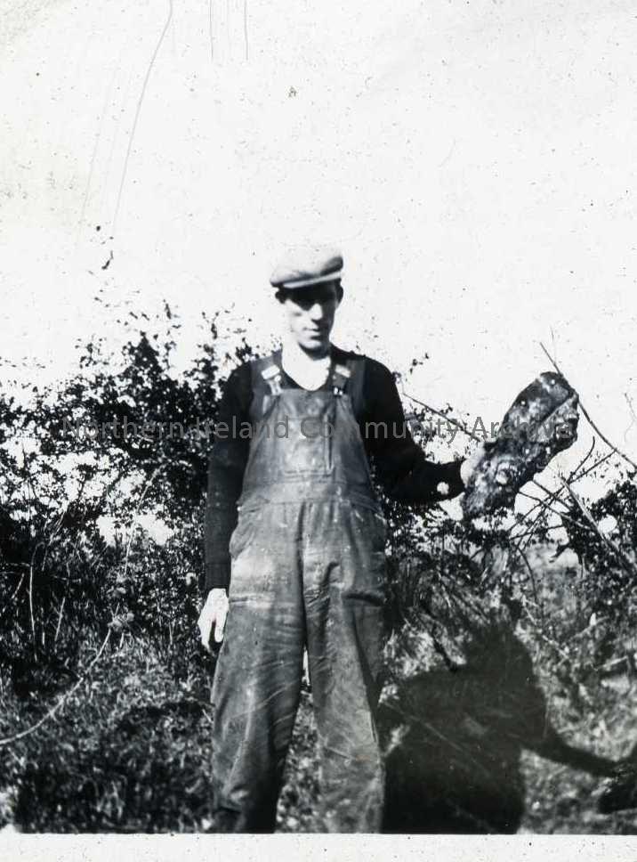 Man outdoors with charred wood - Moneygran. (JM - The man is John McGrath and the piece of charred wood is from the St John's Eve bonfire. John McGrath died about 1974 and said that he had given SH the song 'The Moneygran Pig Hunt'). St John's Eve (or Oiche Fheile Eoin) is celebrated in many parts of Ireland with the lighting of bonfires. This ancient custom has its roots in pre-Christian Irish society when the Celts honored the Goddess ~ine, the Celtic equivalent of Venus and Aphrodite. She was the Goddess Queen of Munster and Christianised rituals in her honour (as Naomh ~ine) took place until the nineteenth century on Knockainy, (Cnoc ~ine ~ the Hill of ~ine) in County Limerick.During the festival, people would say prayers, asking for God's blessing upon their crops. They would also take ashes from the fire, and spread them over their land as a blessing for protection for their crops. It was also common to have music, singing, dancing, and games during the festival. The fire was used for destroying small objects of piety (rosary beads, statues, etc.) without disrespecting God. It was also common for people to jump through the flames of the bonfire for good luck.