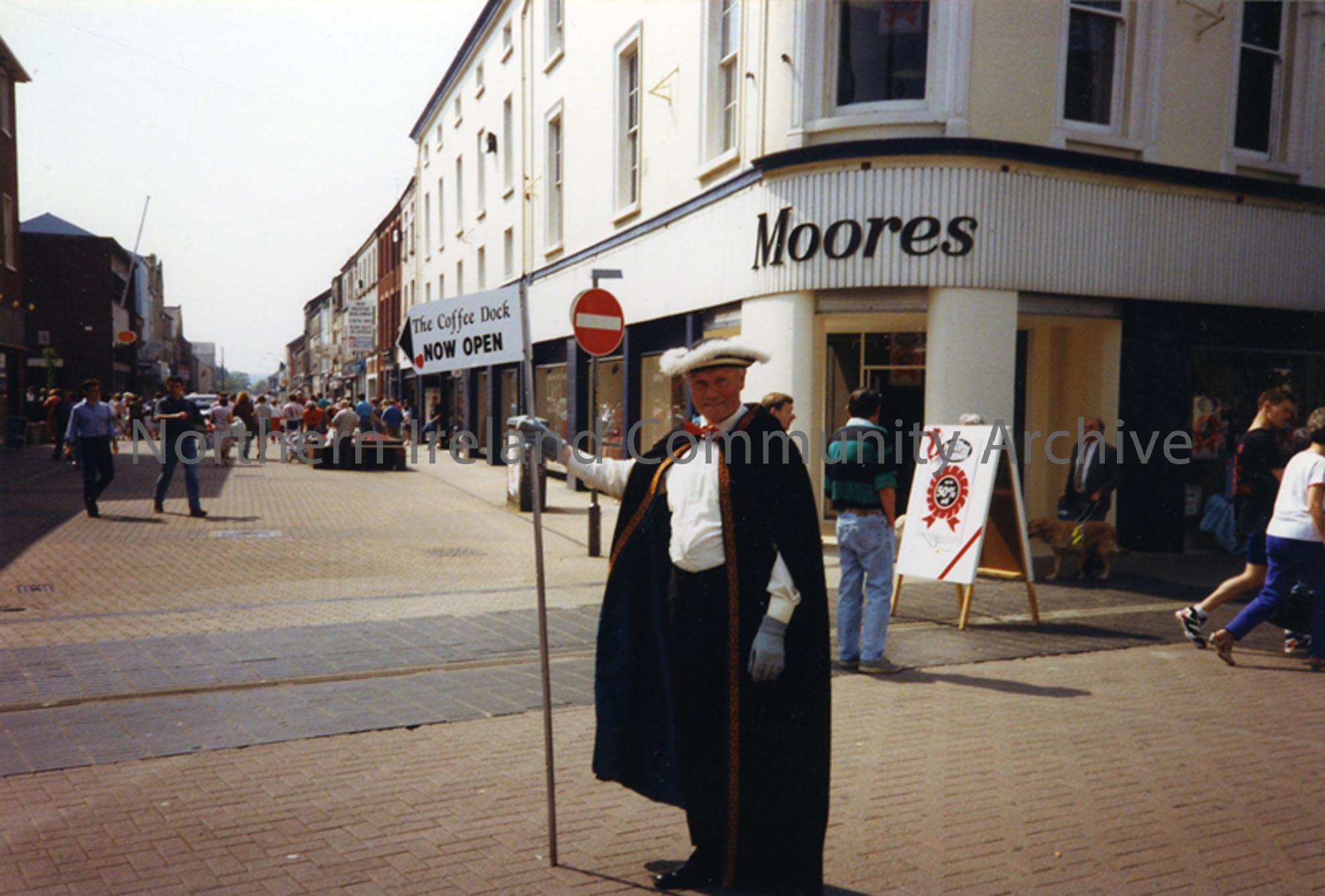 1992. A man stands at the corner of Moores, Coleraine, wearing robes and a hat. He is holding an arrow shaped sign with 'The Coffee Dock NOW OPEN' written on it.
