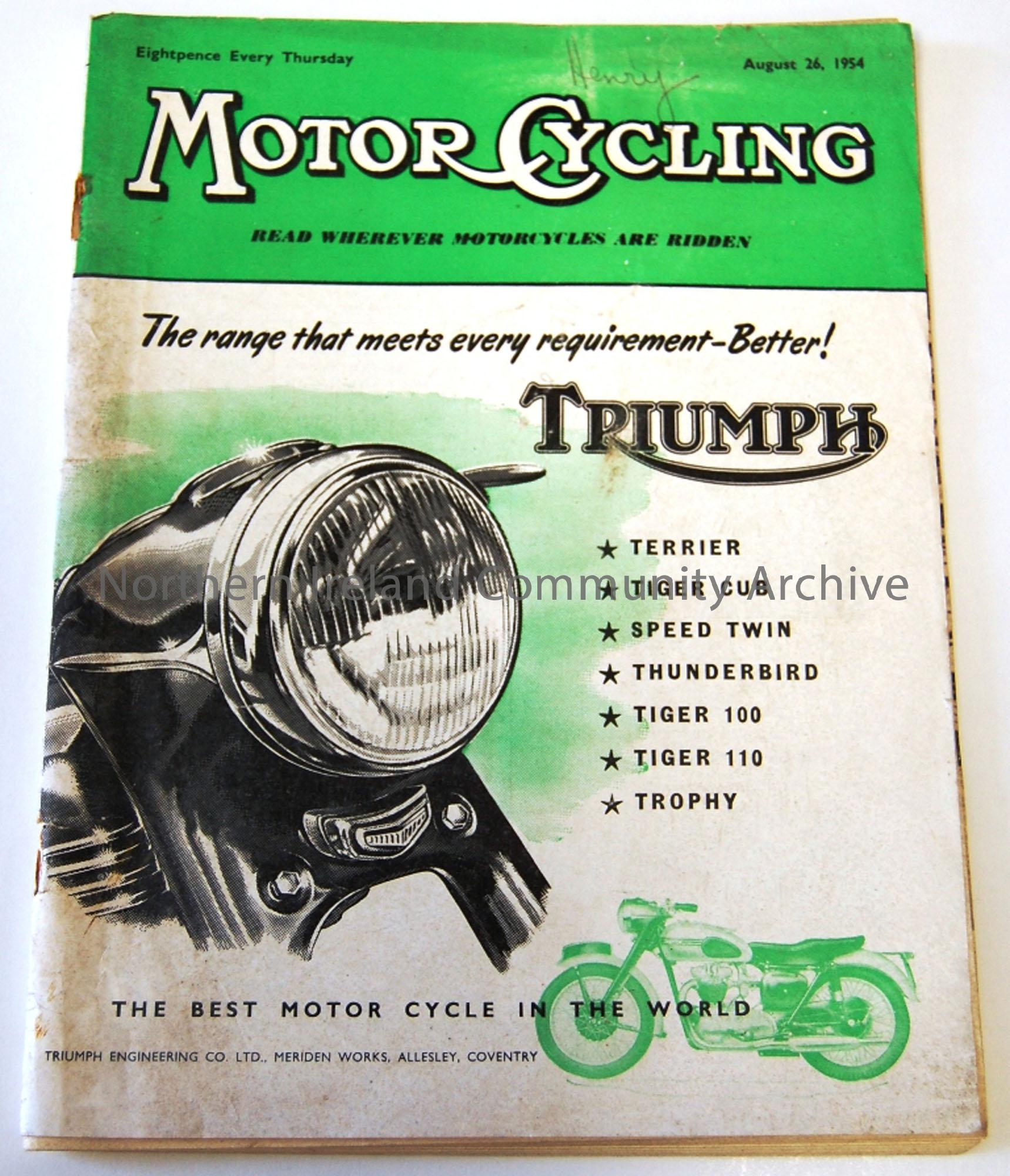Motor cycling, read wherever motorcyclists are ridden- August 26, 1954