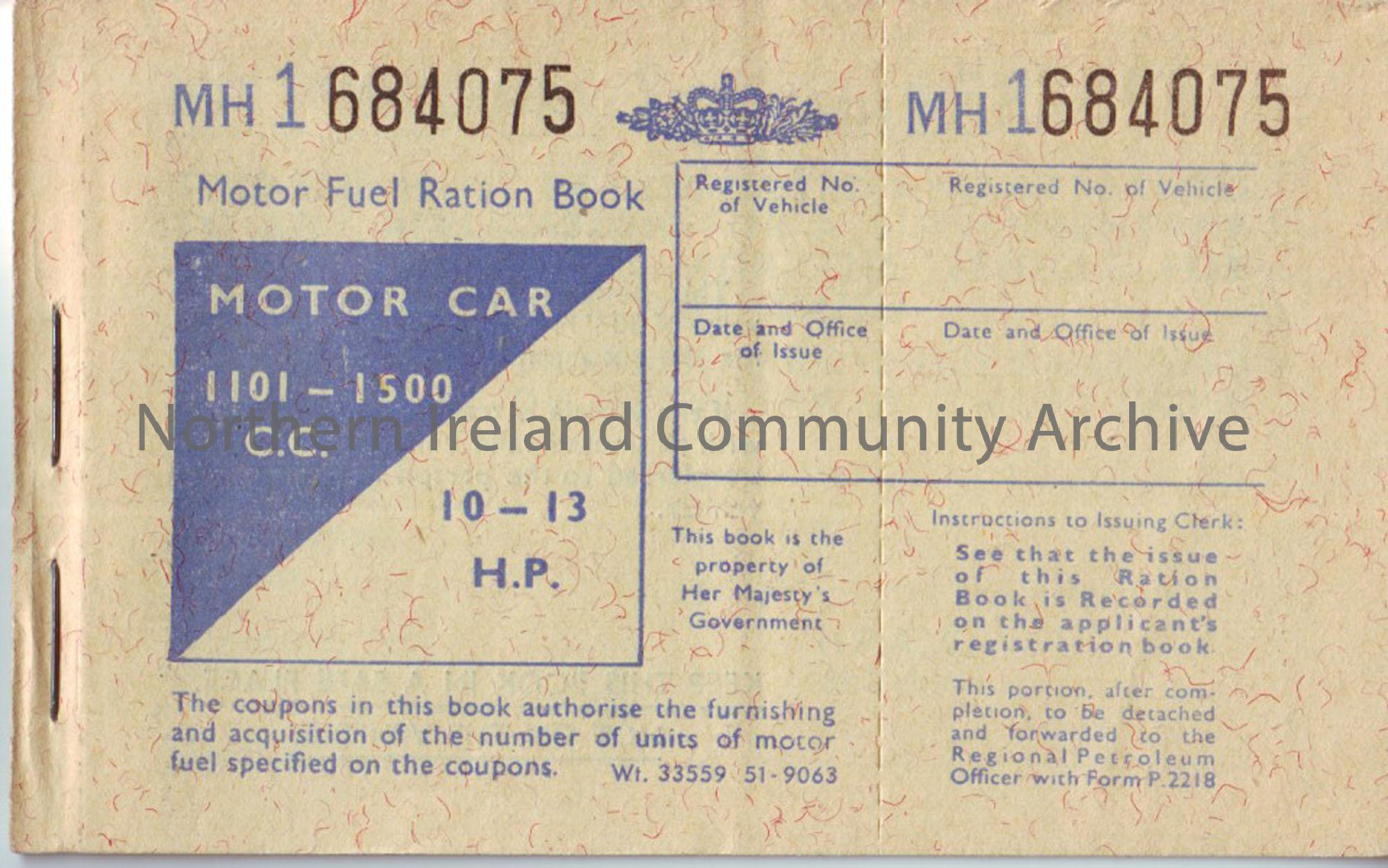 Motor fuel ration book- MH1 684075 Motor car 1101-1500 c.c 10-13 H.P