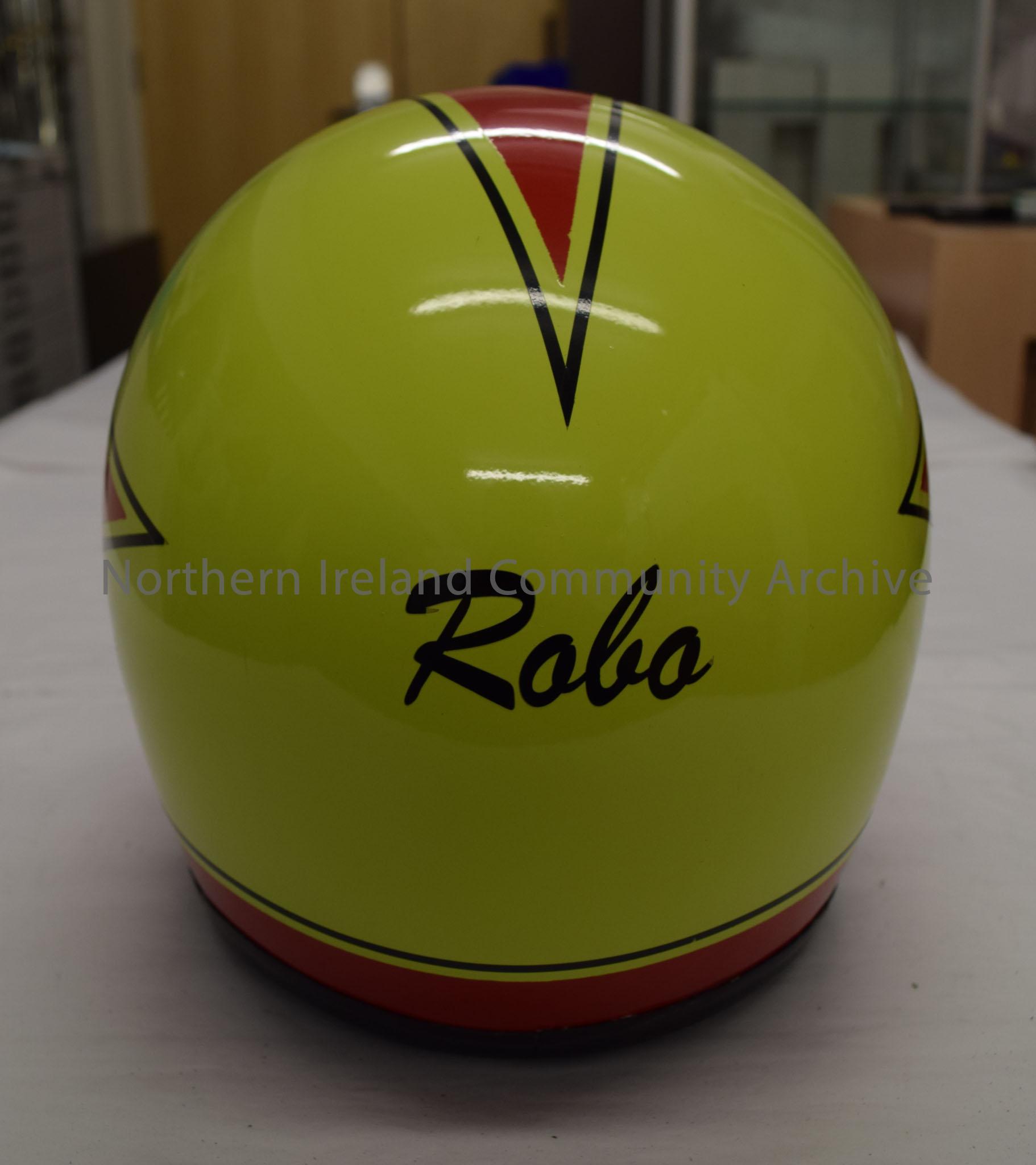 Motorcycle helmet belonging to Mervyn Robinson. Red at the front reaching back to three points with a green/yellow background and a black border. Silh… – 2016.52 (4)