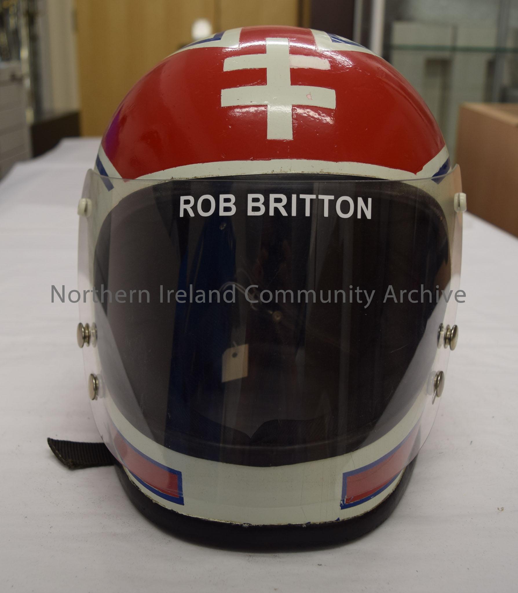 Motorcycle helmet belonging to Rob Britton. White helmet with red pattern with white two tiered cross on the front and blue trim.