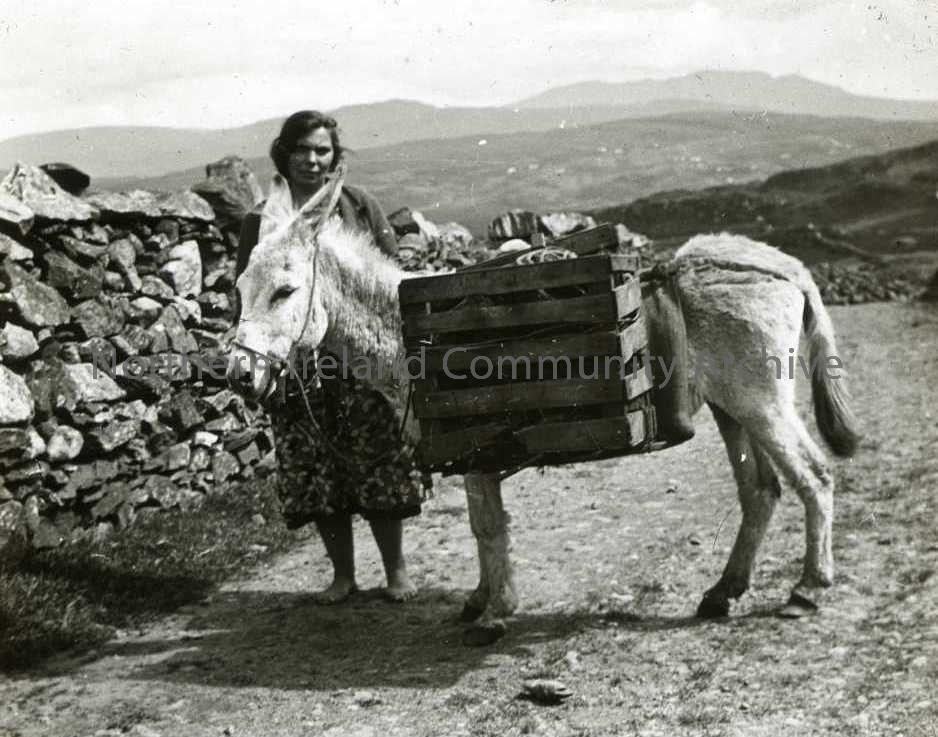 Woman on hillside against stone wall, with donkey with wooden panniers