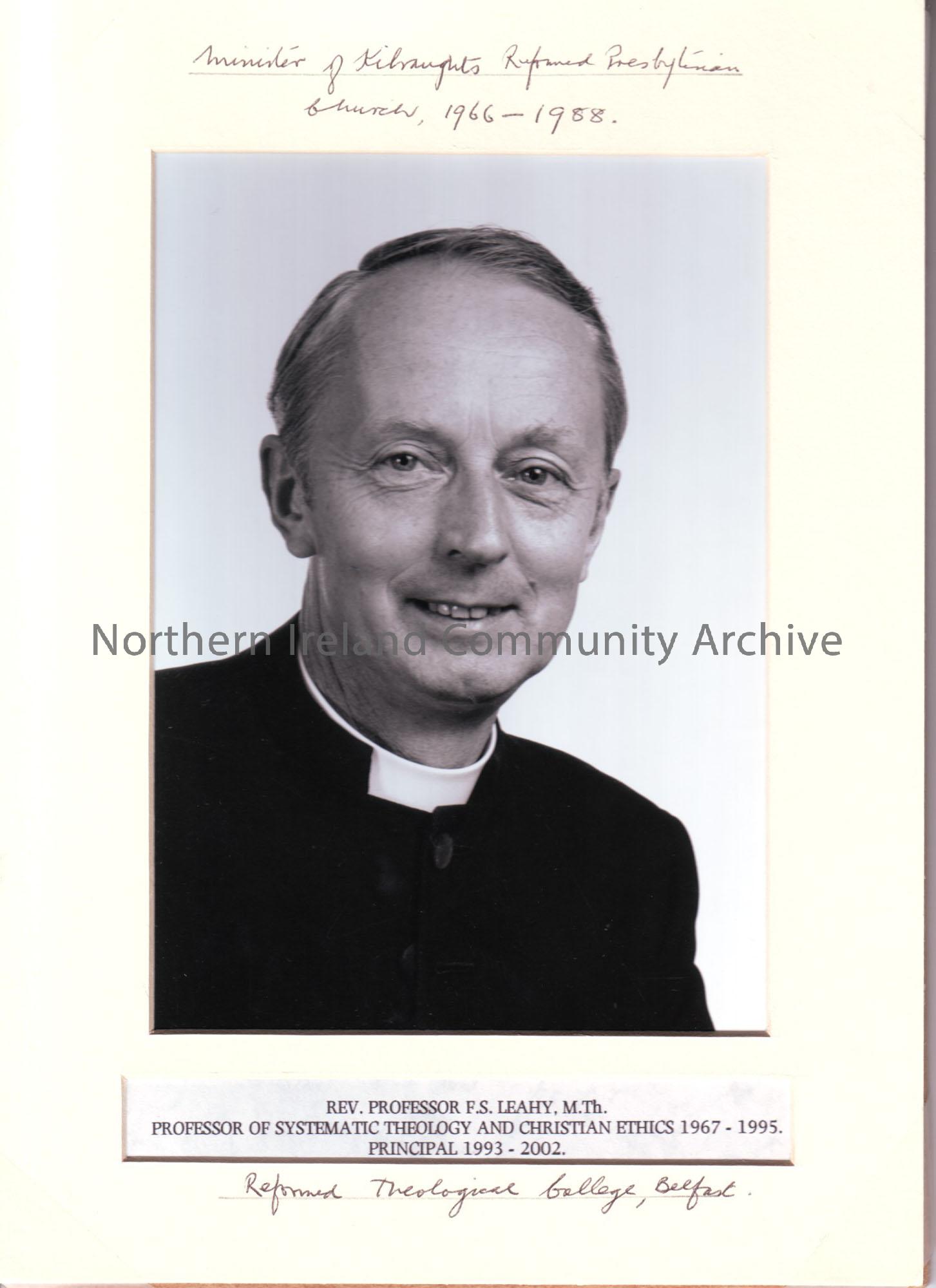 Mounted photograph of Rev.Professor F.S.Leahy, Minister of Kilraughts Reformed Presbyterian church, 1966-1988. M.Th. Professor of systematic theology and christian ethics 1967-1995. Principal 1993-2002. Reformed Theological college, Belfast.