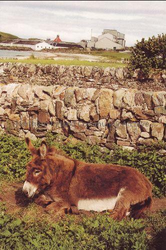 Islay, Port Ellen - Historic links re-created at the Lammas Fair in 1993. Barney the donkey was purchased by Archie Curry at the animal market in Ballycastle and transported to Islay. He was featured on Gaelic television in Scotland and used to publicise Islay on this postcard, emphasising the Ballycastle links.