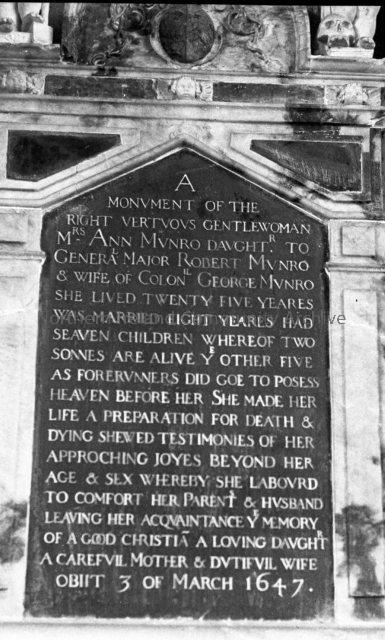 Munro memorial in St Patricks Church. Both inside and outside the Church are memorials and gravestones which pay tribute to people who lived in Coleraine in the 17th century. Munro was a familiar family name. Courtesy of the Sam Henry Collection.