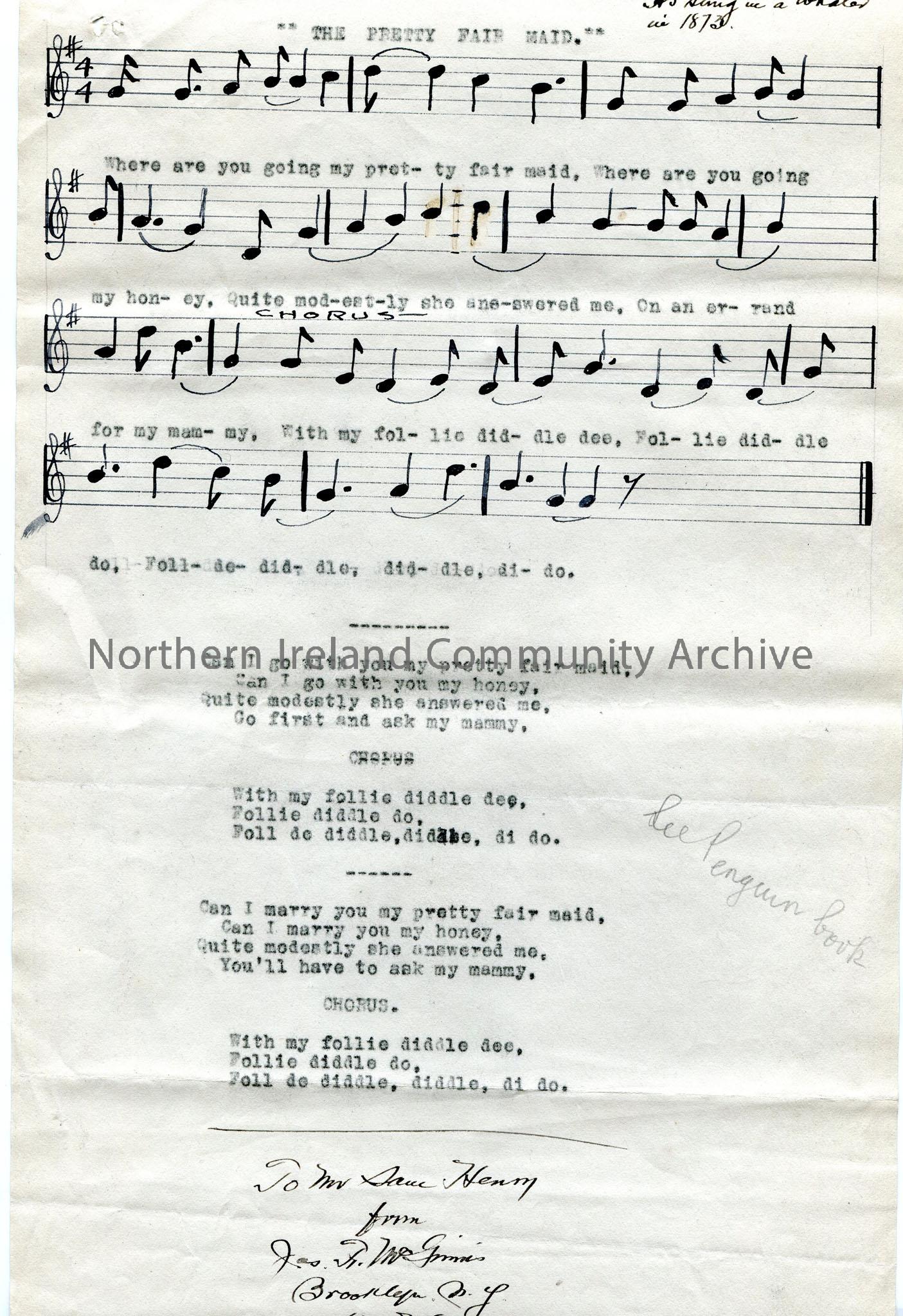 Music and words to ‘The Pretty Fair Maid’. One of a bundle of documents pinned together, from Joseph McGinnis, who had a keen interest in songs sung b…