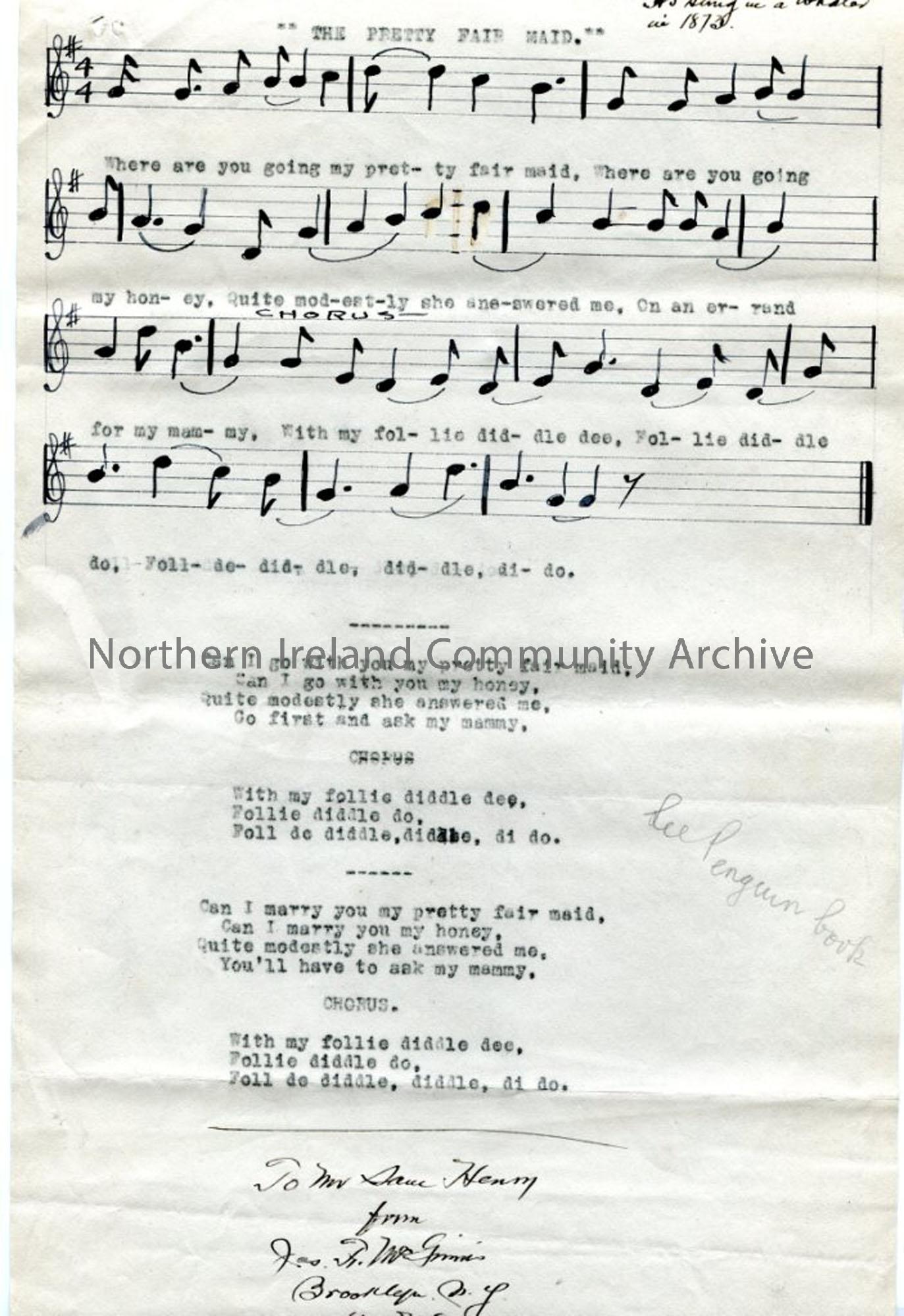 Music and words to 'The Pretty Fair Maid'. One of a bundle of documents pinned together, from Joseph McGinnis, who had a keen interest in songs sung by sailors.
