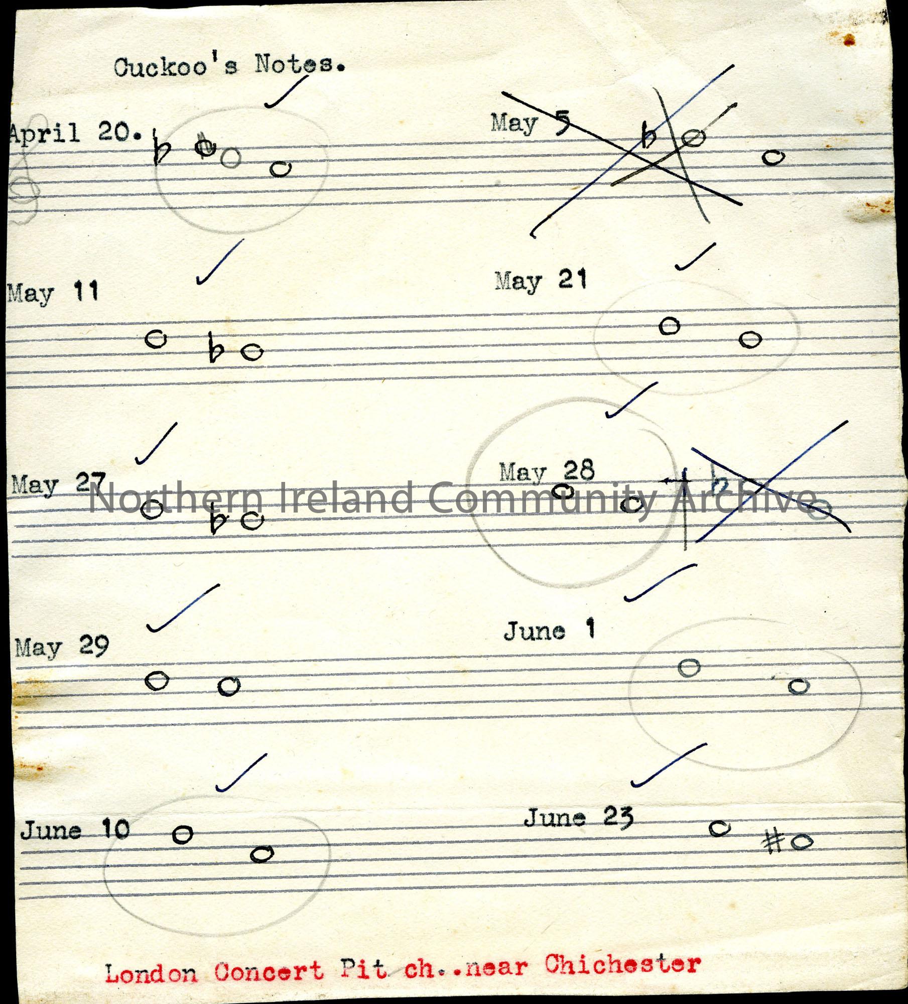 Music titled, 'Cuckoo's Notes'. Handwritten musical notes beside calendar months April, May and June. 'London Concert Pitch...near Chichester' typed in red below notes.