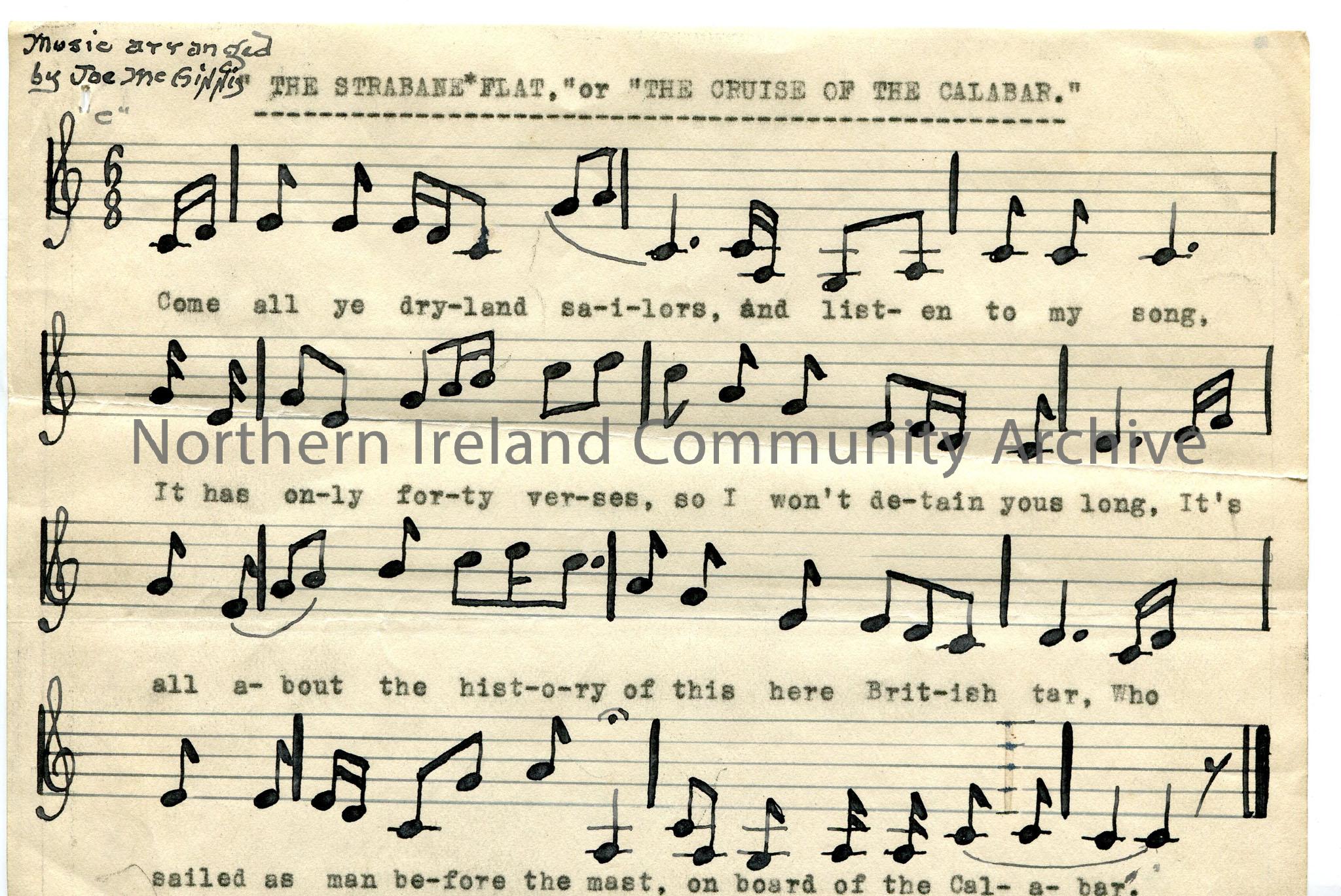 Musical notation for 'The Cruise of the Calabar'. Hand written note on sheet says 'arranged by' Joseph. One of a bundle of documents pinned together, from Joseph McGinnis, who had a keen interest in songs sung by sailors.