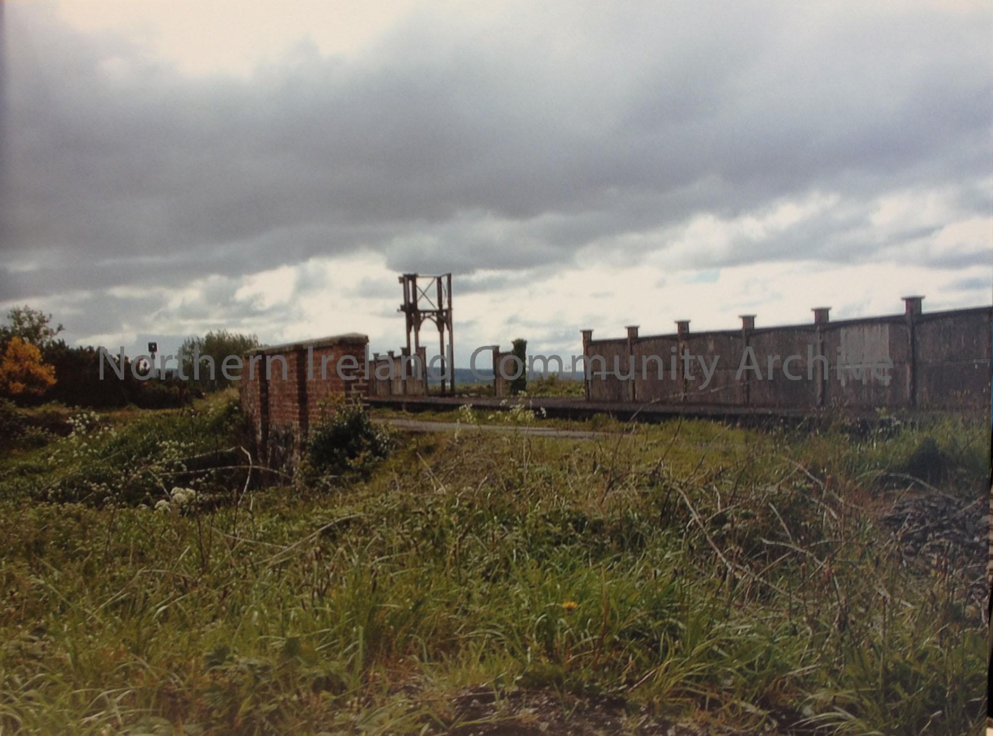 Distant view of remaining red brick wall on one platform + tower+wall on other platform