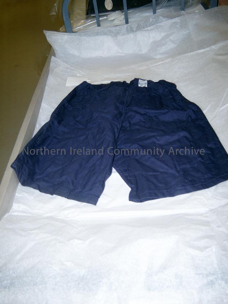 navy canvas shorts. Label reads size no.3, waist 34 inches. Conlowe Ltd. 1941. (3133)