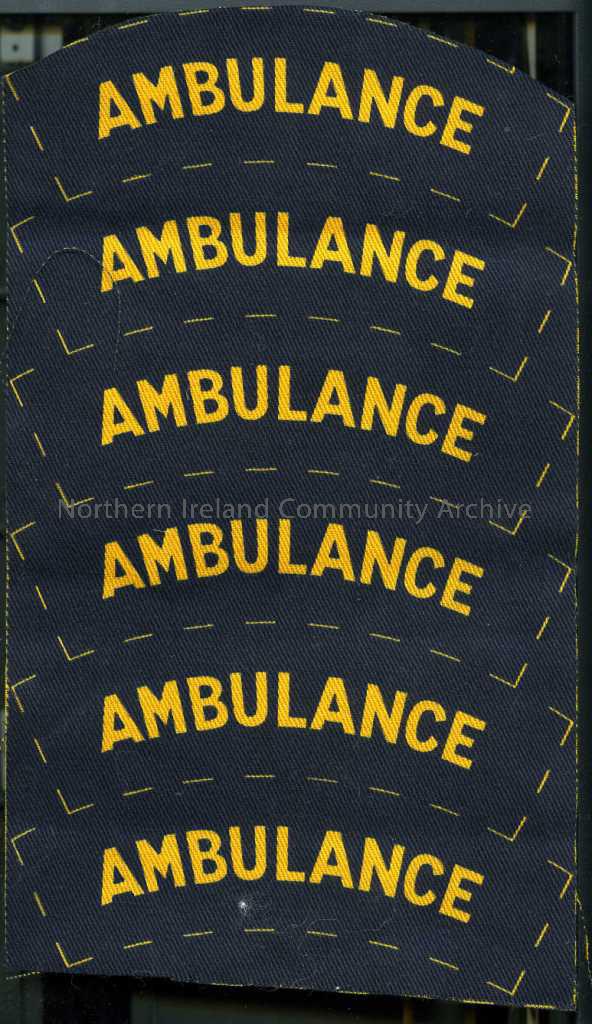 Navy with yellow writing – ‘Ambulance’. Six on one piece of material.