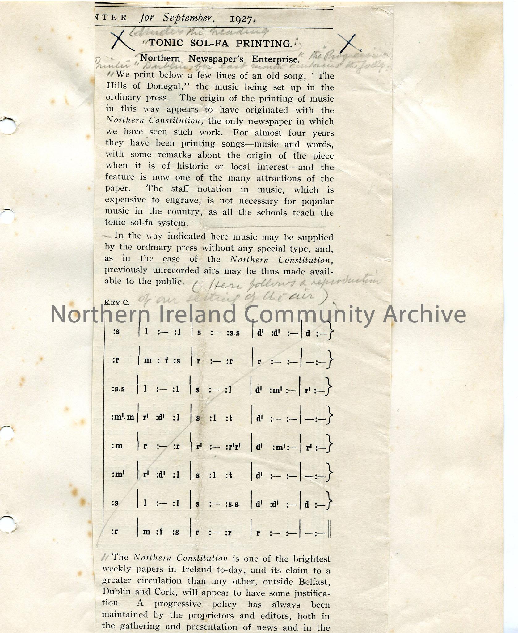 Newspaper article affixed to page. Title – ‘Tonic Sol-Fa Printing. Northern Newspaper’s Enterprise’.