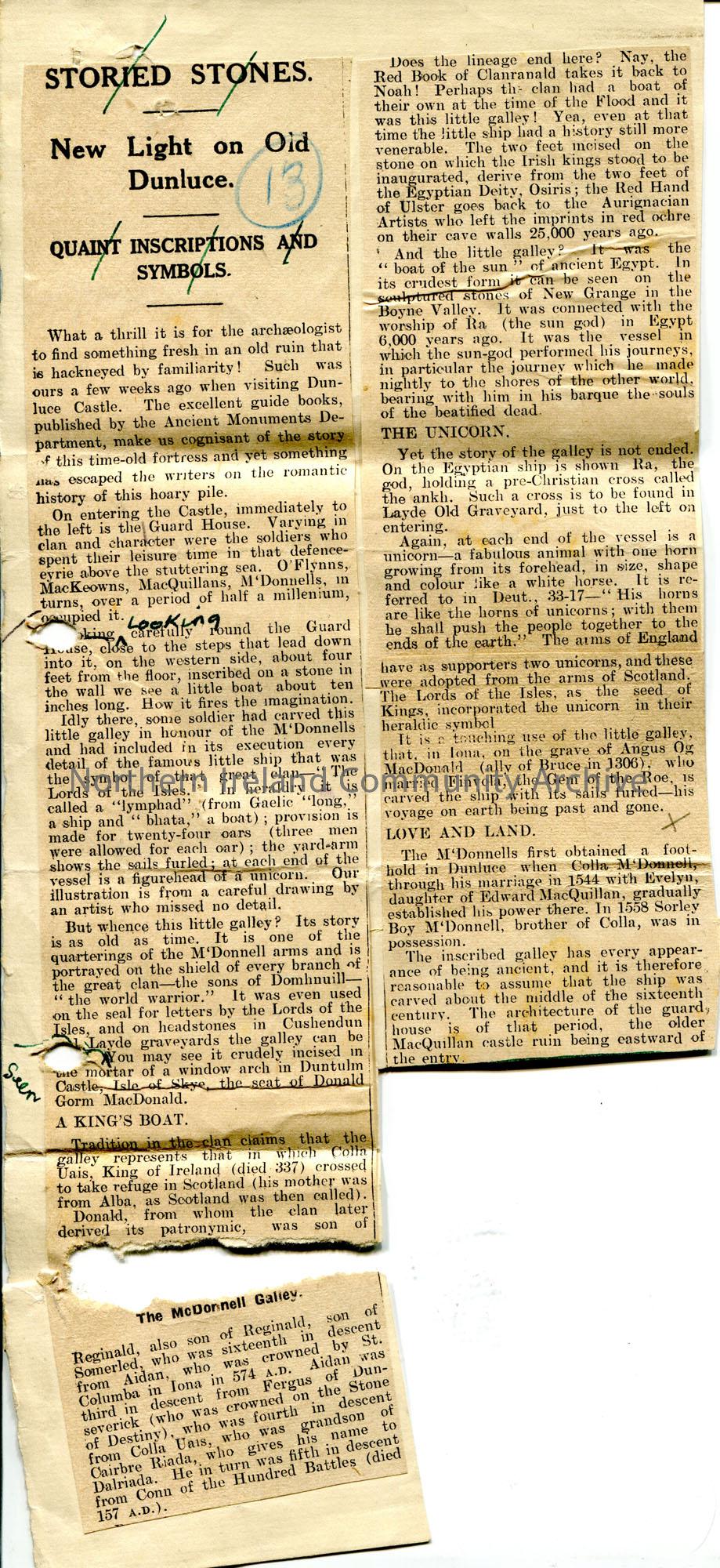 Newspaper article cut and pasted to page. Titled, 'Storied Stones. New Light on Old Dunluce. Quaint Inscriptions and Symbols'. Re Dunluce Castle. Circled number '13' at top of article. One of a bundle of documents in draft form in the making of the book 'Dunluce and Giant's Causeway'.