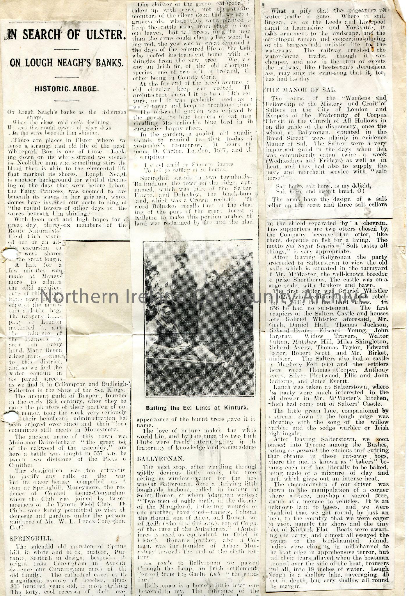 Newspaper article cut out and stuck to page. Titled, "In Search of Ulster. On Lough Neagh's Banks. Historic Arboe. Article recounts a day trip by the Route Naturalists Field Club and their travels to the mansion at Springhill, through Ballyronan and the Manor of Sal, Salterstown. Includes photographic image of 2 adults and a child titled, 'Baiting the Eld Lines at Kinturk'.