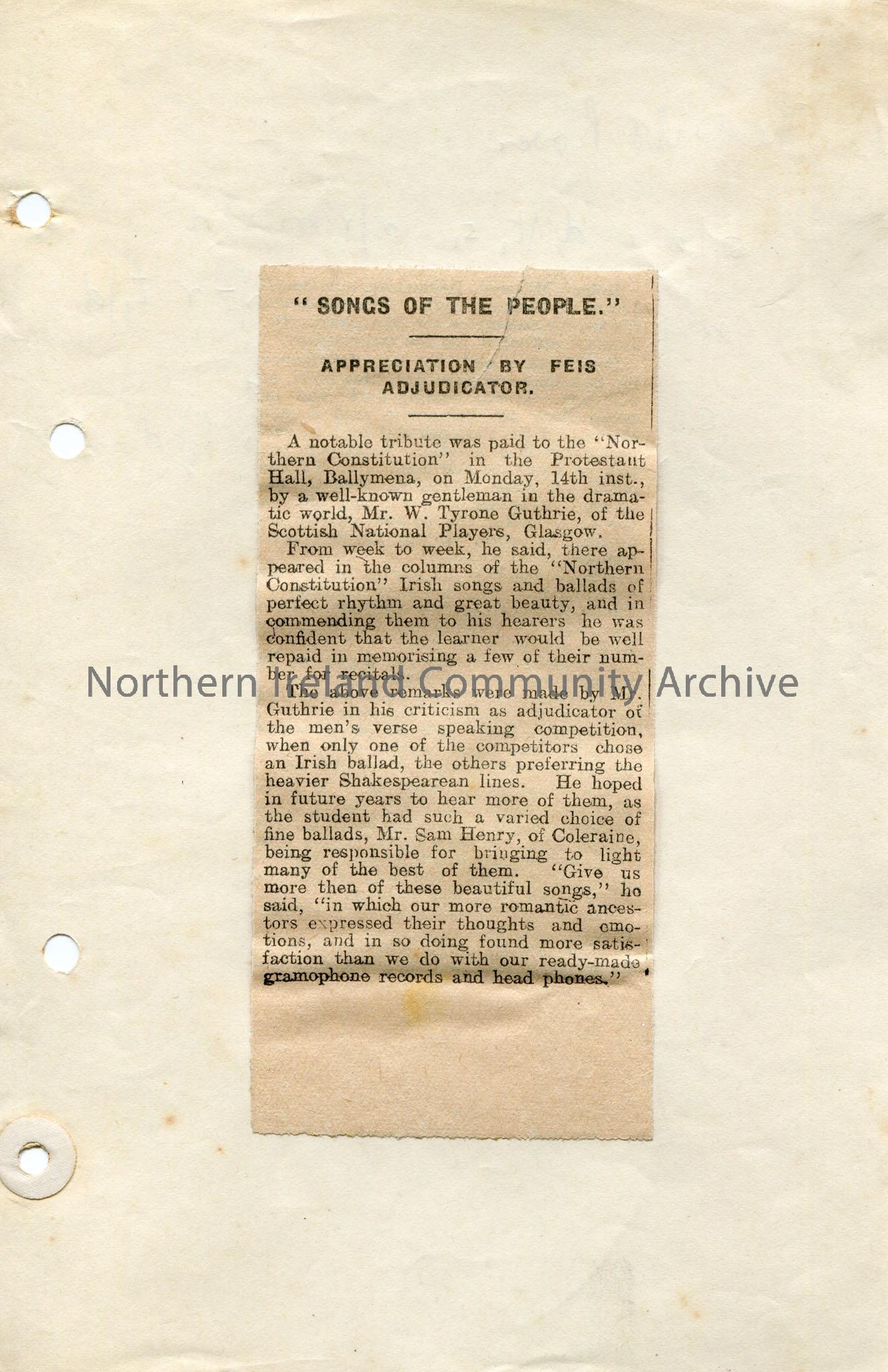 Newspaper article cut out and stuck to paper. Titled, ‘Songs of the People. Appreciation by Feis Adjudicator’. Mr W. Tyrone Guthrie, Scottish National…