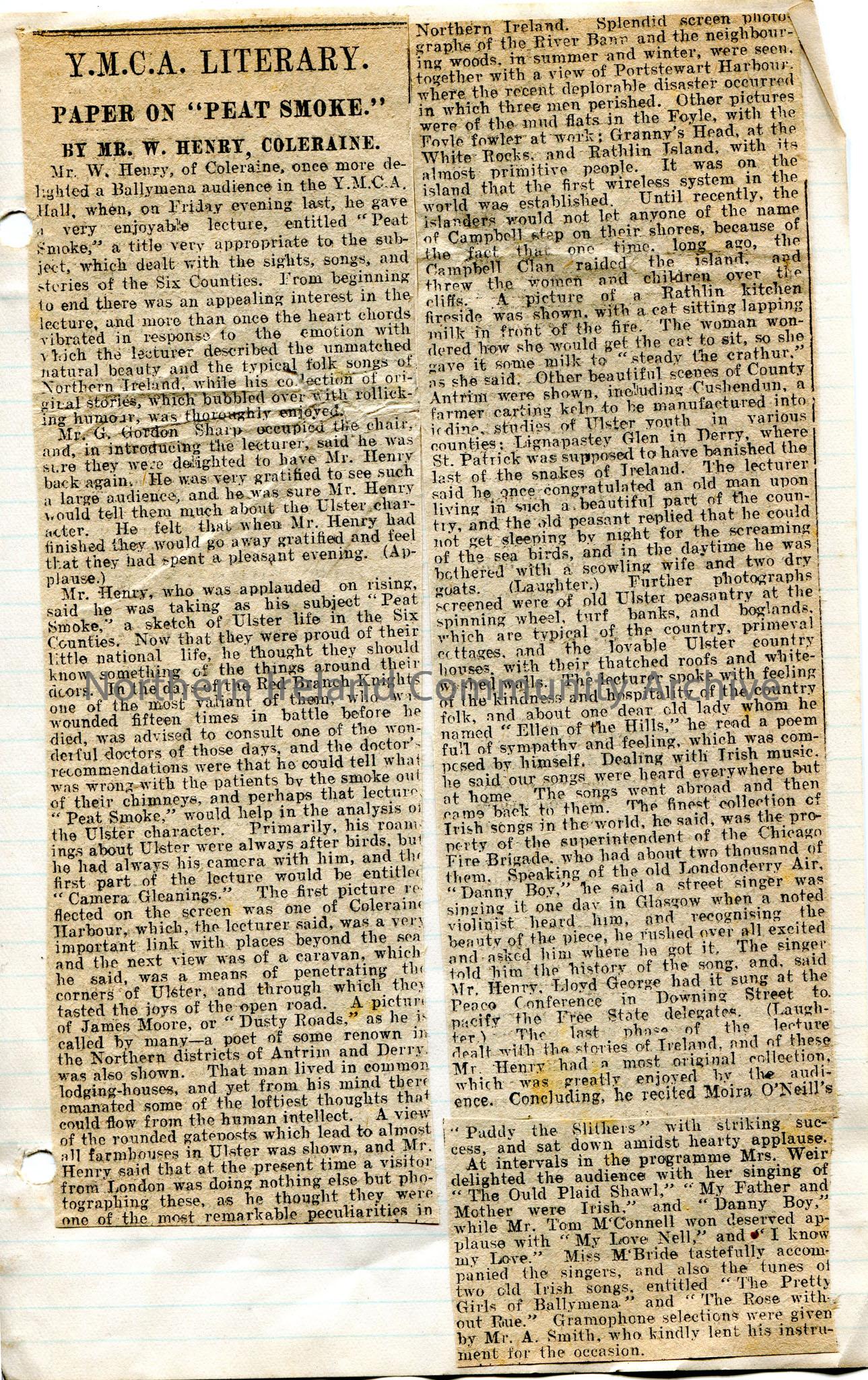 Newspaper article cut out and stuck to paper, two columns. Titled, Y.M.C.A. Literary. Paper on "Peat Smoke." By Mr. W. Henry, Coleraine'. Review of the lecture re the 'sights, songs and stories of the Six Counties'. The article provides a commentary of the use of the slides used in the lecture and which have been accessioned as CM:2017:641.