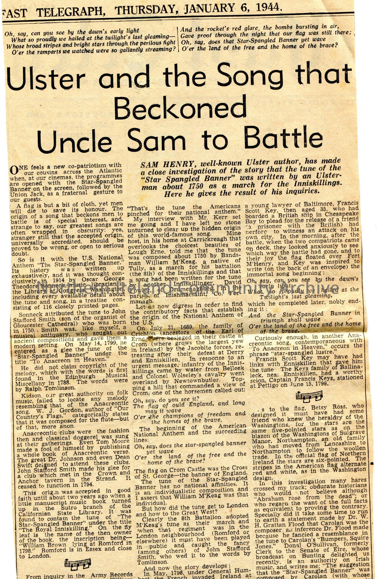 Newspaper article cutting from the 'Belfast Telegraph'. Dated 6th January, 1944. Titled, 'Ulster and the Song that Beckoned Uncle Sam to Battle'. Article by Sam Henry who gives the results from his investigation that the song 'Star Spangled Banner' was written by an Ulster man for the Royal Inniskilling Fusiliers. Sam believes this to be feasible.