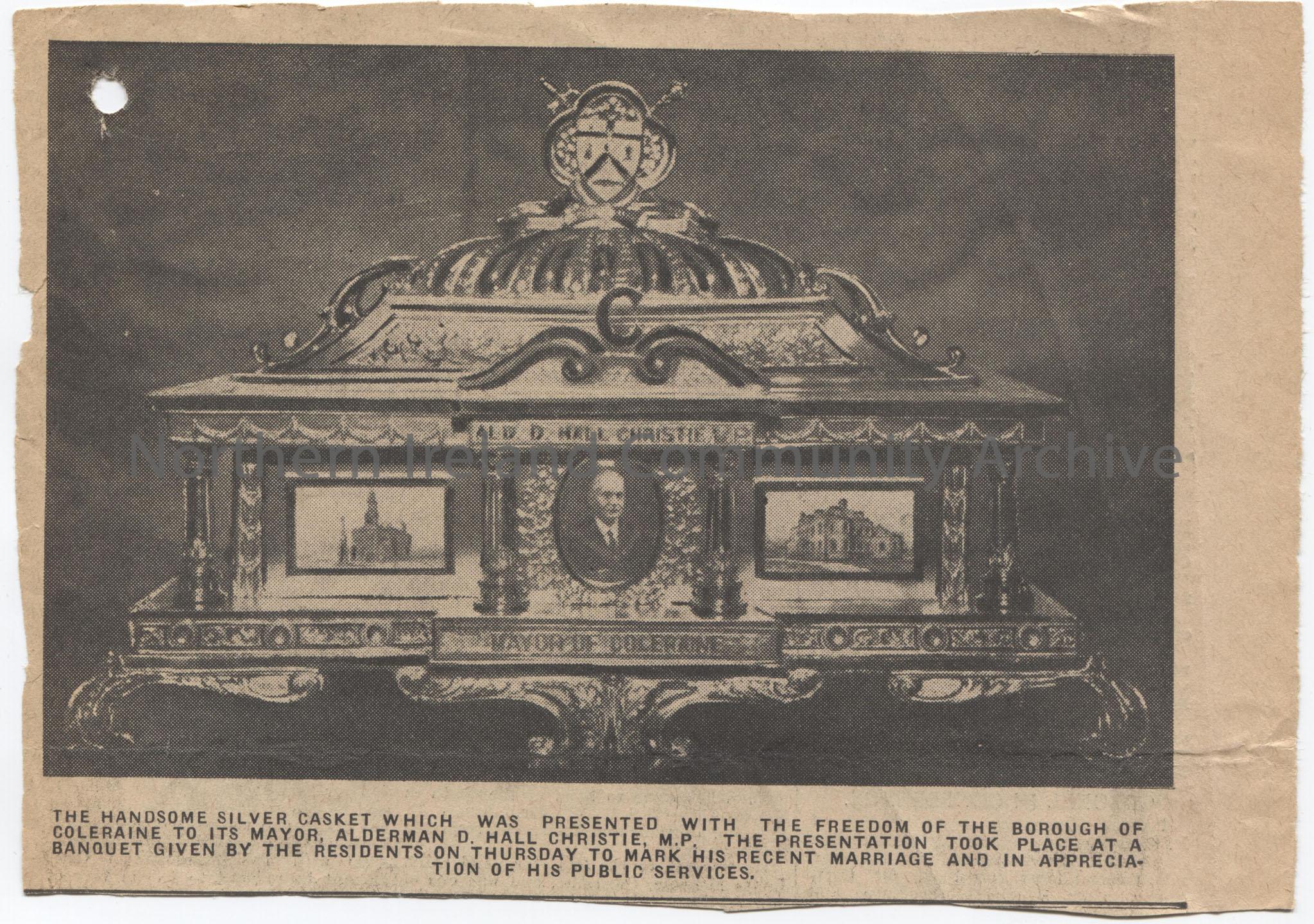 Newspaper clipping - photograph of the silver casket presented with the Freedom of the Borough of Coleraine to Mayor Alderman D. Hall Christie.